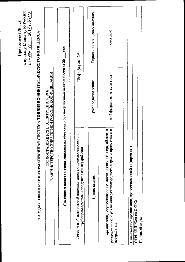 "ОБ УТВЕРЖДЕНИИ ФОРМ ПРЕДОСТАВЛЕНИЯ В ОБЯЗАТЕЛЬНОМ ПОРЯДКЕ ОРГАНАМИ ИСПОЛНИТЕЛЬНОЙ ВЛАСТИ СУБЪЕКТОВ РОССИЙСКОЙ ФЕДЕРАЦИИ И ЮРИДИЧЕСКИМИ ЛИЦАМИ ИНФОРМАЦИИ ДЛЯ ВКЛЮЧЕНИЯ В СЕГМЕНТ В ОБЛАСТИ ГАЗОВОЙ ПРОМЫШЛЕННОСТИ, ТРАНСПОРТИРОВКИ ПО ТРУБОПРОВОДАМ ГАЗА И ПРОДУКТОВ ЕГО ПЕРЕРАБОТКИ ГОСУДАРСТВЕННОЙ ИНФОРМАЦИОННОЙ СИСТЕМЫ ТОПЛИВНО - ЭНЕРГЕТИЧЕСКОГО КОМПЛЕКСА И ТРЕБОВАНИЙ К ЗАПОЛНЕНИЮ ЭТИХ ФОРМ"