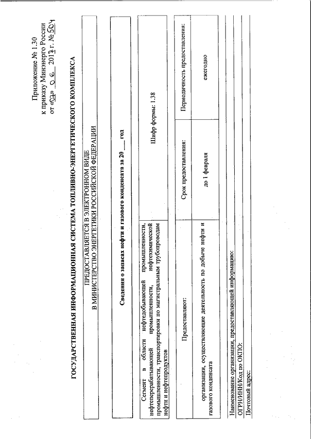 "ОБ УТВЕРЖДЕНИИ ФОРМ ПРЕДОСТАВЛЕНИЯ В ОБЯЗАТЕЛЬНОМ ПОРЯДКЕ ОРГАНАМИ ИСПОЛНИТЕЛЬНОЙ ВЛАСТИ СУБЪЕКТОВ РОССИЙСКОЙ ФЕДЕРАЦИИ И ЮРИДИЧЕСКИМИ ЛИЦАМИ ИНФОРМАЦИИ ДЛЯ ВКЛЮЧЕНИЯ В СЕГМЕНТ В ОБЛАСТИ НЕФТЕДОБЫВАЮЩЕЙ ПРОМЫШЛЕННОСТИ, НЕФТЕПЕРЕРАБАТЫВАЮЩЕЙ ПРОМЫШЛЕННОСТИ, НЕФТЕХИМИЧЕСКОЙ ПРОМЫШЛЕННОСТИ, ТРАНСПОРТИРОВКИ ПО МАГИСТРАЛЬНЫМ ТРУБОПРОВОДАМ НЕФТИ И НЕФТЕПРОДУКТОВ ГОСУДАРСТВЕННОЙ ИНФОРМАЦИОННОЙ СИСТЕМЫ ТОПЛИВНО - ЭНЕРГЕТИЧЕСКОГО КОМПЛЕКСА И ТРЕБОВАНИЙ К ЗАПОЛНЕНИЮ ЭТИХ ФОРМ"