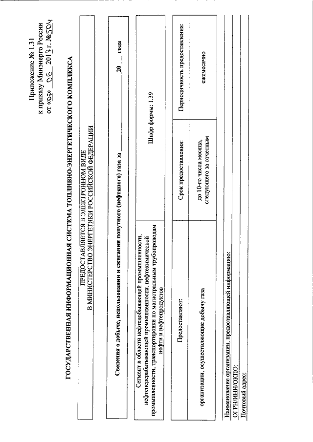 "ОБ УТВЕРЖДЕНИИ ФОРМ ПРЕДОСТАВЛЕНИЯ В ОБЯЗАТЕЛЬНОМ ПОРЯДКЕ ОРГАНАМИ ИСПОЛНИТЕЛЬНОЙ ВЛАСТИ СУБЪЕКТОВ РОССИЙСКОЙ ФЕДЕРАЦИИ И ЮРИДИЧЕСКИМИ ЛИЦАМИ ИНФОРМАЦИИ ДЛЯ ВКЛЮЧЕНИЯ В СЕГМЕНТ В ОБЛАСТИ НЕФТЕДОБЫВАЮЩЕЙ ПРОМЫШЛЕННОСТИ, НЕФТЕПЕРЕРАБАТЫВАЮЩЕЙ ПРОМЫШЛЕННОСТИ, НЕФТЕХИМИЧЕСКОЙ ПРОМЫШЛЕННОСТИ, ТРАНСПОРТИРОВКИ ПО МАГИСТРАЛЬНЫМ ТРУБОПРОВОДАМ НЕФТИ И НЕФТЕПРОДУКТОВ ГОСУДАРСТВЕННОЙ ИНФОРМАЦИОННОЙ СИСТЕМЫ ТОПЛИВНО - ЭНЕРГЕТИЧЕСКОГО КОМПЛЕКСА И ТРЕБОВАНИЙ К ЗАПОЛНЕНИЮ ЭТИХ ФОРМ"