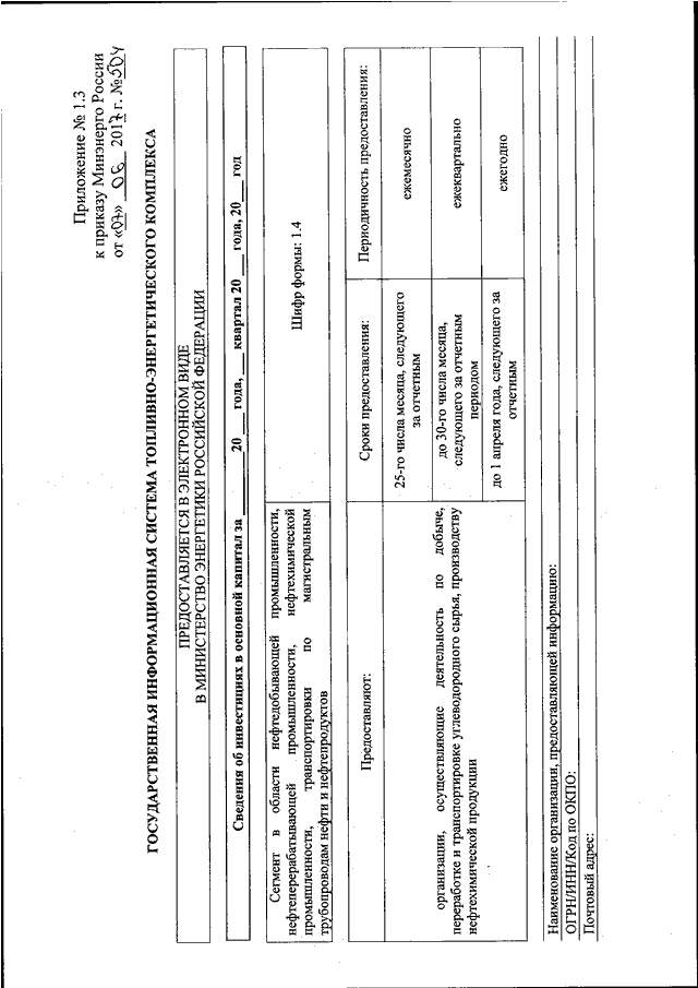 "ОБ УТВЕРЖДЕНИИ ФОРМ ПРЕДОСТАВЛЕНИЯ В ОБЯЗАТЕЛЬНОМ ПОРЯДКЕ ОРГАНАМИ ИСПОЛНИТЕЛЬНОЙ ВЛАСТИ СУБЪЕКТОВ РОССИЙСКОЙ ФЕДЕРАЦИИ И ЮРИДИЧЕСКИМИ ЛИЦАМИ ИНФОРМАЦИИ ДЛЯ ВКЛЮЧЕНИЯ В СЕГМЕНТ В ОБЛАСТИ НЕФТЕДОБЫВАЮЩЕЙ ПРОМЫШЛЕННОСТИ, НЕФТЕПЕРЕРАБАТЫВАЮЩЕЙ ПРОМЫШЛЕННОСТИ, НЕФТЕХИМИЧЕСКОЙ ПРОМЫШЛЕННОСТИ, ТРАНСПОРТИРОВКИ ПО МАГИСТРАЛЬНЫМ ТРУБОПРОВОДАМ НЕФТИ И НЕФТЕПРОДУКТОВ ГОСУДАРСТВЕННОЙ ИНФОРМАЦИОННОЙ СИСТЕМЫ ТОПЛИВНО - ЭНЕРГЕТИЧЕСКОГО КОМПЛЕКСА И ТРЕБОВАНИЙ К ЗАПОЛНЕНИЮ ЭТИХ ФОРМ"