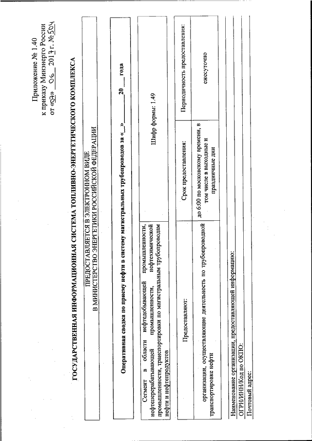 "ОБ УТВЕРЖДЕНИИ ФОРМ ПРЕДОСТАВЛЕНИЯ В ОБЯЗАТЕЛЬНОМ ПОРЯДКЕ ОРГАНАМИ ИСПОЛНИТЕЛЬНОЙ ВЛАСТИ СУБЪЕКТОВ РОССИЙСКОЙ ФЕДЕРАЦИИ И ЮРИДИЧЕСКИМИ ЛИЦАМИ ИНФОРМАЦИИ ДЛЯ ВКЛЮЧЕНИЯ В СЕГМЕНТ В ОБЛАСТИ НЕФТЕДОБЫВАЮЩЕЙ ПРОМЫШЛЕННОСТИ, НЕФТЕПЕРЕРАБАТЫВАЮЩЕЙ ПРОМЫШЛЕННОСТИ, НЕФТЕХИМИЧЕСКОЙ ПРОМЫШЛЕННОСТИ, ТРАНСПОРТИРОВКИ ПО МАГИСТРАЛЬНЫМ ТРУБОПРОВОДАМ НЕФТИ И НЕФТЕПРОДУКТОВ ГОСУДАРСТВЕННОЙ ИНФОРМАЦИОННОЙ СИСТЕМЫ ТОПЛИВНО - ЭНЕРГЕТИЧЕСКОГО КОМПЛЕКСА И ТРЕБОВАНИЙ К ЗАПОЛНЕНИЮ ЭТИХ ФОРМ"