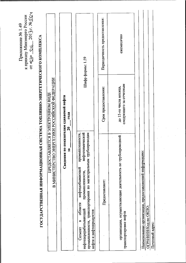 "ОБ УТВЕРЖДЕНИИ ФОРМ ПРЕДОСТАВЛЕНИЯ В ОБЯЗАТЕЛЬНОМ ПОРЯДКЕ ОРГАНАМИ ИСПОЛНИТЕЛЬНОЙ ВЛАСТИ СУБЪЕКТОВ РОССИЙСКОЙ ФЕДЕРАЦИИ И ЮРИДИЧЕСКИМИ ЛИЦАМИ ИНФОРМАЦИИ ДЛЯ ВКЛЮЧЕНИЯ В СЕГМЕНТ В ОБЛАСТИ НЕФТЕДОБЫВАЮЩЕЙ ПРОМЫШЛЕННОСТИ, НЕФТЕПЕРЕРАБАТЫВАЮЩЕЙ ПРОМЫШЛЕННОСТИ, НЕФТЕХИМИЧЕСКОЙ ПРОМЫШЛЕННОСТИ, ТРАНСПОРТИРОВКИ ПО МАГИСТРАЛЬНЫМ ТРУБОПРОВОДАМ НЕФТИ И НЕФТЕПРОДУКТОВ ГОСУДАРСТВЕННОЙ ИНФОРМАЦИОННОЙ СИСТЕМЫ ТОПЛИВНО - ЭНЕРГЕТИЧЕСКОГО КОМПЛЕКСА И ТРЕБОВАНИЙ К ЗАПОЛНЕНИЮ ЭТИХ ФОРМ"