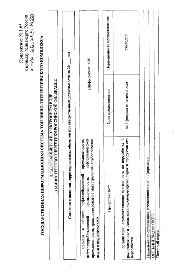 "ОБ УТВЕРЖДЕНИИ ФОРМ ПРЕДОСТАВЛЕНИЯ В ОБЯЗАТЕЛЬНОМ ПОРЯДКЕ ОРГАНАМИ ИСПОЛНИТЕЛЬНОЙ ВЛАСТИ СУБЪЕКТОВ РОССИЙСКОЙ ФЕДЕРАЦИИ И ЮРИДИЧЕСКИМИ ЛИЦАМИ ИНФОРМАЦИИ ДЛЯ ВКЛЮЧЕНИЯ В СЕГМЕНТ В ОБЛАСТИ НЕФТЕДОБЫВАЮЩЕЙ ПРОМЫШЛЕННОСТИ, НЕФТЕПЕРЕРАБАТЫВАЮЩЕЙ ПРОМЫШЛЕННОСТИ, НЕФТЕХИМИЧЕСКОЙ ПРОМЫШЛЕННОСТИ, ТРАНСПОРТИРОВКИ ПО МАГИСТРАЛЬНЫМ ТРУБОПРОВОДАМ НЕФТИ И НЕФТЕПРОДУКТОВ ГОСУДАРСТВЕННОЙ ИНФОРМАЦИОННОЙ СИСТЕМЫ ТОПЛИВНО - ЭНЕРГЕТИЧЕСКОГО КОМПЛЕКСА И ТРЕБОВАНИЙ К ЗАПОЛНЕНИЮ ЭТИХ ФОРМ"
