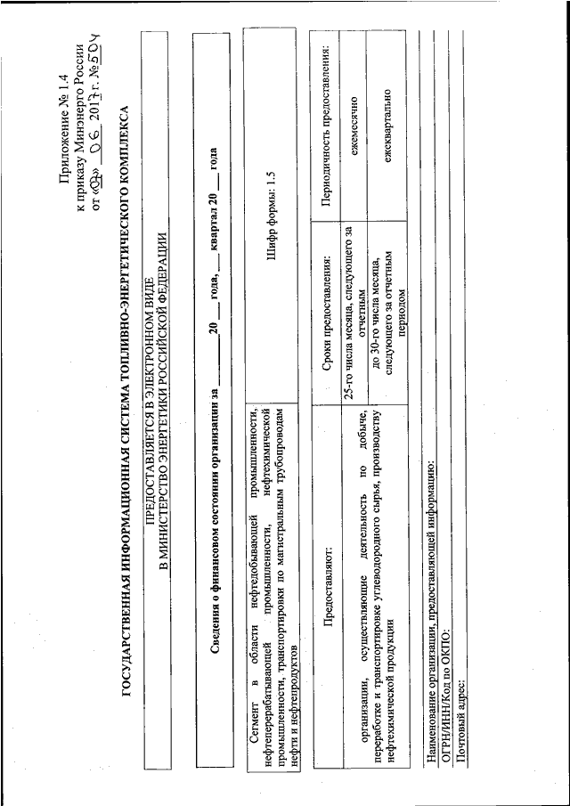 "ОБ УТВЕРЖДЕНИИ ФОРМ ПРЕДОСТАВЛЕНИЯ В ОБЯЗАТЕЛЬНОМ ПОРЯДКЕ ОРГАНАМИ ИСПОЛНИТЕЛЬНОЙ ВЛАСТИ СУБЪЕКТОВ РОССИЙСКОЙ ФЕДЕРАЦИИ И ЮРИДИЧЕСКИМИ ЛИЦАМИ ИНФОРМАЦИИ ДЛЯ ВКЛЮЧЕНИЯ В СЕГМЕНТ В ОБЛАСТИ НЕФТЕДОБЫВАЮЩЕЙ ПРОМЫШЛЕННОСТИ, НЕФТЕПЕРЕРАБАТЫВАЮЩЕЙ ПРОМЫШЛЕННОСТИ, НЕФТЕХИМИЧЕСКОЙ ПРОМЫШЛЕННОСТИ, ТРАНСПОРТИРОВКИ ПО МАГИСТРАЛЬНЫМ ТРУБОПРОВОДАМ НЕФТИ И НЕФТЕПРОДУКТОВ ГОСУДАРСТВЕННОЙ ИНФОРМАЦИОННОЙ СИСТЕМЫ ТОПЛИВНО - ЭНЕРГЕТИЧЕСКОГО КОМПЛЕКСА И ТРЕБОВАНИЙ К ЗАПОЛНЕНИЮ ЭТИХ ФОРМ"