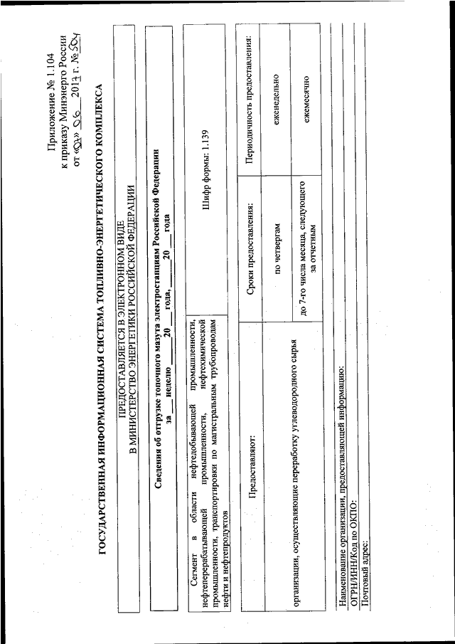 "ОБ УТВЕРЖДЕНИИ ФОРМ ПРЕДОСТАВЛЕНИЯ В ОБЯЗАТЕЛЬНОМ ПОРЯДКЕ ОРГАНАМИ ИСПОЛНИТЕЛЬНОЙ ВЛАСТИ СУБЪЕКТОВ РОССИЙСКОЙ ФЕДЕРАЦИИ И ЮРИДИЧЕСКИМИ ЛИЦАМИ ИНФОРМАЦИИ ДЛЯ ВКЛЮЧЕНИЯ В СЕГМЕНТ В ОБЛАСТИ НЕФТЕДОБЫВАЮЩЕЙ ПРОМЫШЛЕННОСТИ, НЕФТЕПЕРЕРАБАТЫВАЮЩЕЙ ПРОМЫШЛЕННОСТИ, НЕФТЕХИМИЧЕСКОЙ ПРОМЫШЛЕННОСТИ, ТРАНСПОРТИРОВКИ ПО МАГИСТРАЛЬНЫМ ТРУБОПРОВОДАМ НЕФТИ И НЕФТЕПРОДУКТОВ ГОСУДАРСТВЕННОЙ ИНФОРМАЦИОННОЙ СИСТЕМЫ ТОПЛИВНО - ЭНЕРГЕТИЧЕСКОГО КОМПЛЕКСА И ТРЕБОВАНИЙ К ЗАПОЛНЕНИЮ ЭТИХ ФОРМ"