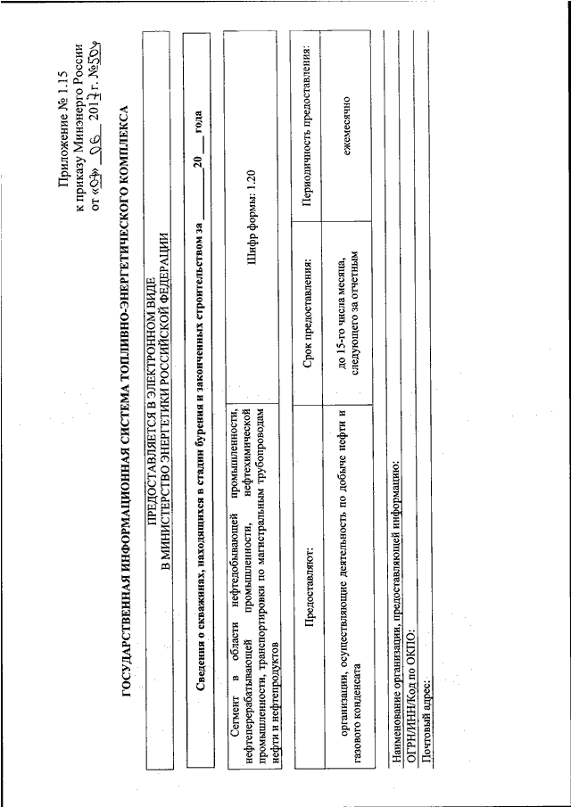 "ОБ УТВЕРЖДЕНИИ ФОРМ ПРЕДОСТАВЛЕНИЯ В ОБЯЗАТЕЛЬНОМ ПОРЯДКЕ ОРГАНАМИ ИСПОЛНИТЕЛЬНОЙ ВЛАСТИ СУБЪЕКТОВ РОССИЙСКОЙ ФЕДЕРАЦИИ И ЮРИДИЧЕСКИМИ ЛИЦАМИ ИНФОРМАЦИИ ДЛЯ ВКЛЮЧЕНИЯ В СЕГМЕНТ В ОБЛАСТИ НЕФТЕДОБЫВАЮЩЕЙ ПРОМЫШЛЕННОСТИ, НЕФТЕПЕРЕРАБАТЫВАЮЩЕЙ ПРОМЫШЛЕННОСТИ, НЕФТЕХИМИЧЕСКОЙ ПРОМЫШЛЕННОСТИ, ТРАНСПОРТИРОВКИ ПО МАГИСТРАЛЬНЫМ ТРУБОПРОВОДАМ НЕФТИ И НЕФТЕПРОДУКТОВ ГОСУДАРСТВЕННОЙ ИНФОРМАЦИОННОЙ СИСТЕМЫ ТОПЛИВНО - ЭНЕРГЕТИЧЕСКОГО КОМПЛЕКСА И ТРЕБОВАНИЙ К ЗАПОЛНЕНИЮ ЭТИХ ФОРМ"