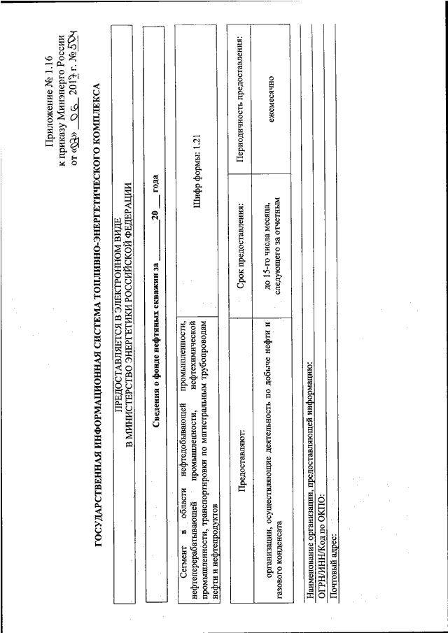 "ОБ УТВЕРЖДЕНИИ ФОРМ ПРЕДОСТАВЛЕНИЯ В ОБЯЗАТЕЛЬНОМ ПОРЯДКЕ ОРГАНАМИ ИСПОЛНИТЕЛЬНОЙ ВЛАСТИ СУБЪЕКТОВ РОССИЙСКОЙ ФЕДЕРАЦИИ И ЮРИДИЧЕСКИМИ ЛИЦАМИ ИНФОРМАЦИИ ДЛЯ ВКЛЮЧЕНИЯ В СЕГМЕНТ В ОБЛАСТИ НЕФТЕДОБЫВАЮЩЕЙ ПРОМЫШЛЕННОСТИ, НЕФТЕПЕРЕРАБАТЫВАЮЩЕЙ ПРОМЫШЛЕННОСТИ, НЕФТЕХИМИЧЕСКОЙ ПРОМЫШЛЕННОСТИ, ТРАНСПОРТИРОВКИ ПО МАГИСТРАЛЬНЫМ ТРУБОПРОВОДАМ НЕФТИ И НЕФТЕПРОДУКТОВ ГОСУДАРСТВЕННОЙ ИНФОРМАЦИОННОЙ СИСТЕМЫ ТОПЛИВНО - ЭНЕРГЕТИЧЕСКОГО КОМПЛЕКСА И ТРЕБОВАНИЙ К ЗАПОЛНЕНИЮ ЭТИХ ФОРМ"