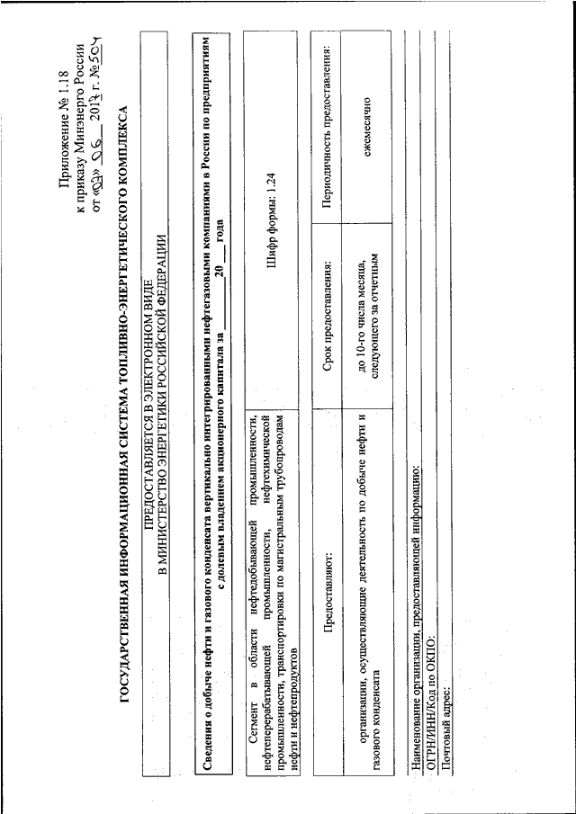 "ОБ УТВЕРЖДЕНИИ ФОРМ ПРЕДОСТАВЛЕНИЯ В ОБЯЗАТЕЛЬНОМ ПОРЯДКЕ ОРГАНАМИ ИСПОЛНИТЕЛЬНОЙ ВЛАСТИ СУБЪЕКТОВ РОССИЙСКОЙ ФЕДЕРАЦИИ И ЮРИДИЧЕСКИМИ ЛИЦАМИ ИНФОРМАЦИИ ДЛЯ ВКЛЮЧЕНИЯ В СЕГМЕНТ В ОБЛАСТИ НЕФТЕДОБЫВАЮЩЕЙ ПРОМЫШЛЕННОСТИ, НЕФТЕПЕРЕРАБАТЫВАЮЩЕЙ ПРОМЫШЛЕННОСТИ, НЕФТЕХИМИЧЕСКОЙ ПРОМЫШЛЕННОСТИ, ТРАНСПОРТИРОВКИ ПО МАГИСТРАЛЬНЫМ ТРУБОПРОВОДАМ НЕФТИ И НЕФТЕПРОДУКТОВ ГОСУДАРСТВЕННОЙ ИНФОРМАЦИОННОЙ СИСТЕМЫ ТОПЛИВНО - ЭНЕРГЕТИЧЕСКОГО КОМПЛЕКСА И ТРЕБОВАНИЙ К ЗАПОЛНЕНИЮ ЭТИХ ФОРМ"
