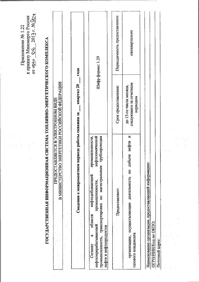 "ОБ УТВЕРЖДЕНИИ ФОРМ ПРЕДОСТАВЛЕНИЯ В ОБЯЗАТЕЛЬНОМ ПОРЯДКЕ ОРГАНАМИ ИСПОЛНИТЕЛЬНОЙ ВЛАСТИ СУБЪЕКТОВ РОССИЙСКОЙ ФЕДЕРАЦИИ И ЮРИДИЧЕСКИМИ ЛИЦАМИ ИНФОРМАЦИИ ДЛЯ ВКЛЮЧЕНИЯ В СЕГМЕНТ В ОБЛАСТИ НЕФТЕДОБЫВАЮЩЕЙ ПРОМЫШЛЕННОСТИ, НЕФТЕПЕРЕРАБАТЫВАЮЩЕЙ ПРОМЫШЛЕННОСТИ, НЕФТЕХИМИЧЕСКОЙ ПРОМЫШЛЕННОСТИ, ТРАНСПОРТИРОВКИ ПО МАГИСТРАЛЬНЫМ ТРУБОПРОВОДАМ НЕФТИ И НЕФТЕПРОДУКТОВ ГОСУДАРСТВЕННОЙ ИНФОРМАЦИОННОЙ СИСТЕМЫ ТОПЛИВНО - ЭНЕРГЕТИЧЕСКОГО КОМПЛЕКСА И ТРЕБОВАНИЙ К ЗАПОЛНЕНИЮ ЭТИХ ФОРМ"