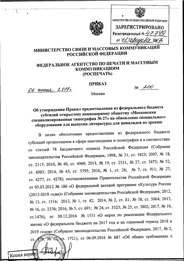 ПРИКАЗ Роспечати от 06.06.2017 N 200