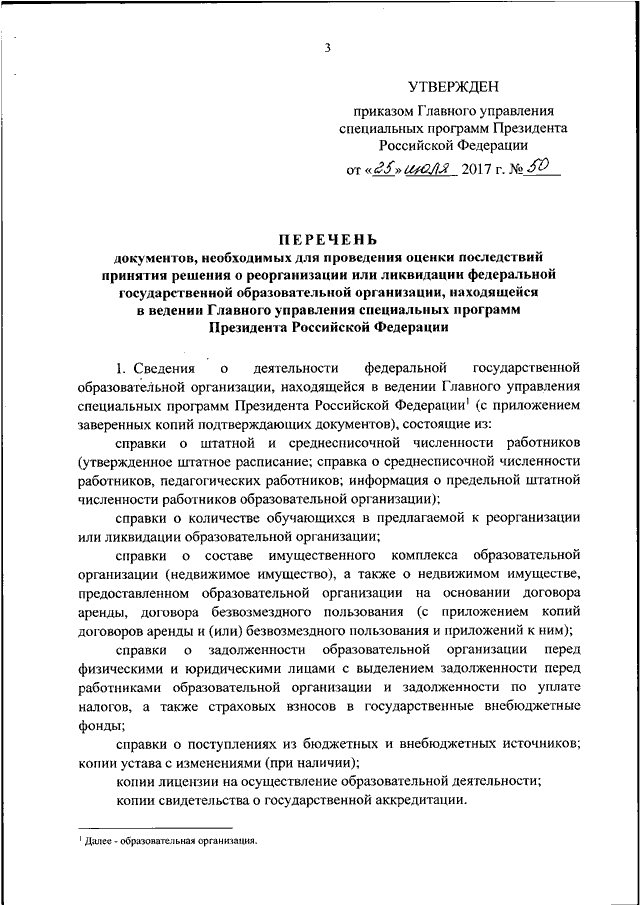 "ОБ УТВЕРЖДЕНИИ ПЕРЕЧНЯ ДОКУМЕНТОВ И ЗНАЧЕНИЙ КРИТЕРИЕВ, НЕОБХОДИМЫХ ДЛЯ ПРОВЕДЕНИЯ ОЦЕНКИ ПОСЛЕДСТВИЙ ПРИНЯТИЯ РЕШЕНИЯ О РЕОРГАНИЗАЦИИ ИЛИ ЛИКВИДАЦИИ ФЕДЕРАЛЬНОЙ ГОСУДАРСТВЕННОЙ ОБРАЗОВАТЕЛЬНОЙ ОРГАНИЗАЦИИ, НАХОДЯЩЕЙСЯ В ВЕДЕНИИ ГЛАВНОГО УПРАВЛЕНИЯ СПЕЦИАЛЬНЫХ ПРОГРАММ ПРЕЗИДЕНТА РОССИЙСКОЙ ФЕДЕРАЦИИ, А ТАКЖЕ ПОЛОЖЕНИЯ О КОМИССИИ ПО ОЦЕНКЕ ПОСЛЕДСТВИЙ ПРИНЯТИЯ РЕШЕНИЯ О РЕОРГАНИЗАЦИИ ИЛИ ЛИКВИДАЦИИ ФЕДЕРАЛЬНОЙ ГОСУДАРСТВЕННОЙ ОБРАЗОВАТЕЛЬНОЙ ОРГАНИЗАЦИИ, НАХОДЯЩЕЙСЯ В ВЕДЕНИИ ГЛАВНОГО УПРАВЛЕНИЯ СПЕЦИАЛЬНЫХ ПРОГРАММ ПРЕЗИДЕНТА РОССИЙСКОЙ ФЕДЕРАЦИИ"