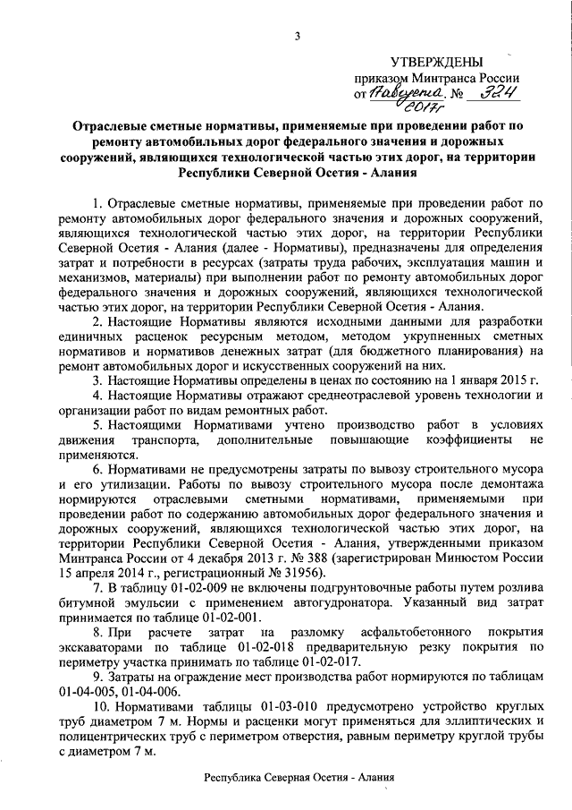 "ОБ УТВЕРЖДЕНИИ ОТРАСЛЕВЫХ СМЕТНЫХ НОРМАТИВОВ, ПРИМЕНЯЕМЫХ ПРИ ПРОВЕДЕНИИ РАБОТ ПО РЕМОНТУ АВТОМОБИЛЬНЫХ ДОРОГ ФЕДЕРАЛЬНОГО ЗНАЧЕНИЯ И ДОРОЖНЫХ СООРУЖЕНИЙ, ЯВЛЯЮЩИХСЯ ТЕХНОЛОГИЧЕСКОЙ ЧАСТЬЮ ЭТИХ ДОРОГ, НА ТЕРРИТОРИИ РЕСПУБЛИКИ СЕВЕРНАЯ ОСЕТИЯ - АЛАНИЯ И О ПРИЗНАНИИ УТРАТИВШИМ СИЛУ ПРИКАЗА МИНТРАНСА РОССИИ ОТ 31 МАРТА 2015 Г. N 73 "ОБ УТВЕРЖДЕНИИ ОТРАСЛЕВЫХ СМЕТНЫХ НОРМАТИВОВ, ПРИМЕНЯЕМЫХ ПРИ ПРОВЕДЕНИИ РАБОТ ПО РЕМОНТУ АВТОМОБИЛЬНЫХ ДОРОГ ФЕДЕРАЛЬНОГО ЗНАЧЕНИЯ И ДОРОЖНЫХ СООРУЖЕНИЙ, ЯВЛЯЮЩИХСЯ ТЕХНОЛОГИЧЕСКОЙ ЧАСТЬЮ ЭТИХ ДОРОГ НА ТЕРРИТОРИИ РЕСПУБЛИКИ СЕВЕРНАЯ ОСЕТИЯ - АЛАНИЯ"