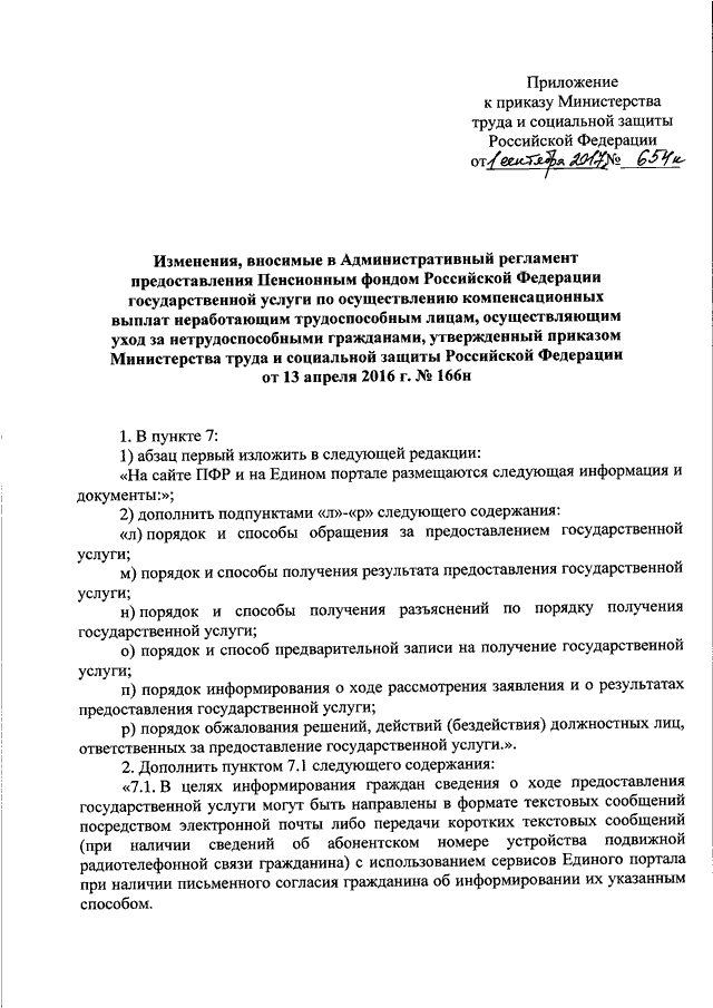 "О ВНЕСЕНИИ ИЗМЕНЕНИЙ В АДМИНИСТРАТИВНЫЙ РЕГЛАМЕНТ ПРЕДОСТАВЛЕНИЯ ПЕНСИОННЫМ ФОНДОМ РОССИЙСКОЙ ФЕДЕРАЦИИ ГОСУДАРСТВЕННОЙ УСЛУГИ ПО ОСУЩЕСТВЛЕНИЮ КОМПЕНСАЦИОННЫХ ВЫПЛАТ НЕРАБОТАЮЩИМ ТРУДОСПОСОБНЫМ ЛИЦАМ, ОСУЩЕСТВЛЯЮЩИМ УХОД ЗА НЕТРУДОСПОСОБНЫМИ ГРАЖДАНАМИ, УТВЕРЖДЕННЫЙ ПРИКАЗОМ МИНИСТЕРСТВА ТРУДА И СОЦИАЛЬНОЙ ЗАЩИТЫ РОССИЙСКОЙ ФЕДЕРАЦИИ ОТ 13 АПРЕЛЯ 2016 Г. N 166Н"