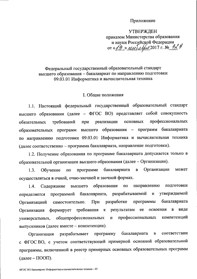 "ОБ УТВЕРЖДЕНИИ ФЕДЕРАЛЬНОГО ГОСУДАРСТВЕННОГО ОБРАЗОВАТЕЛЬНОГО СТАНДАРТА ВЫСШЕГО ОБРАЗОВАНИЯ - БАКАЛАВРИАТ ПО НАПРАВЛЕНИЮ ПОДГОТОВКИ 09.03.01 ИНФОРМАТИКА И ВЫЧИСЛИТЕЛЬНАЯ ТЕХНИКА"
