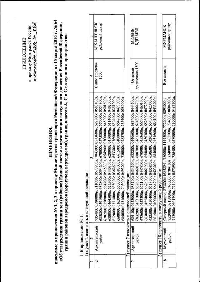 "О ВНЕСЕНИИ ИЗМЕНЕНИЙ В ПРИЛОЖЕНИЯ N 1, 2, 3 К ПРИКАЗУ МИНИСТЕРСТВА ТРАНСПОРТА РОССИЙСКОЙ ФЕДЕРАЦИИ ОТ 15 МАРТА 2016 Г. N 64 "ОБ УТВЕРЖДЕНИИ ГРАНИЦ ЗОН (РАЙОНОВ) ЕДИНОЙ СИСТЕМЫ ОРГАНИЗАЦИИ ВОЗДУШНОГО ДВИЖЕНИЯ РОССИЙСКОЙ ФЕДЕРАЦИИ, ГРАНИЦ РАЙОНОВ АЭРОДРОМОВ (АЭРОУЗЛОВ, ВЕРТОДРОМОВ), ГРАНИЦ КЛАССОВ A, C И G ВОЗДУШНОГО ПРОСТРАНСТВА"