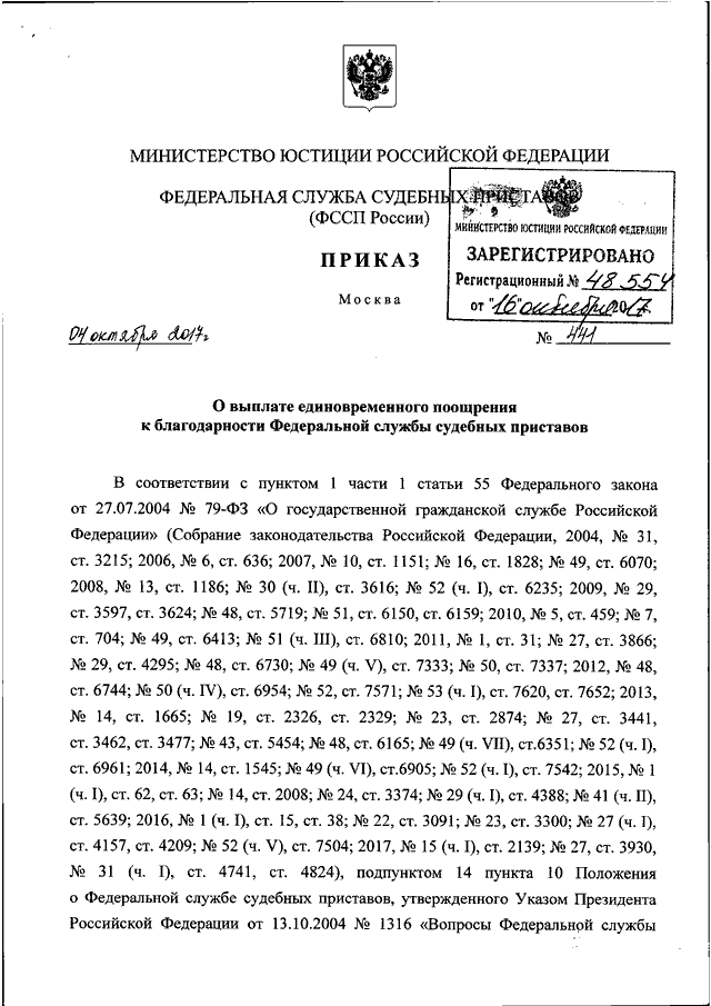 ПРИКАЗ ФССП РФ от 04.10.2017 N 441