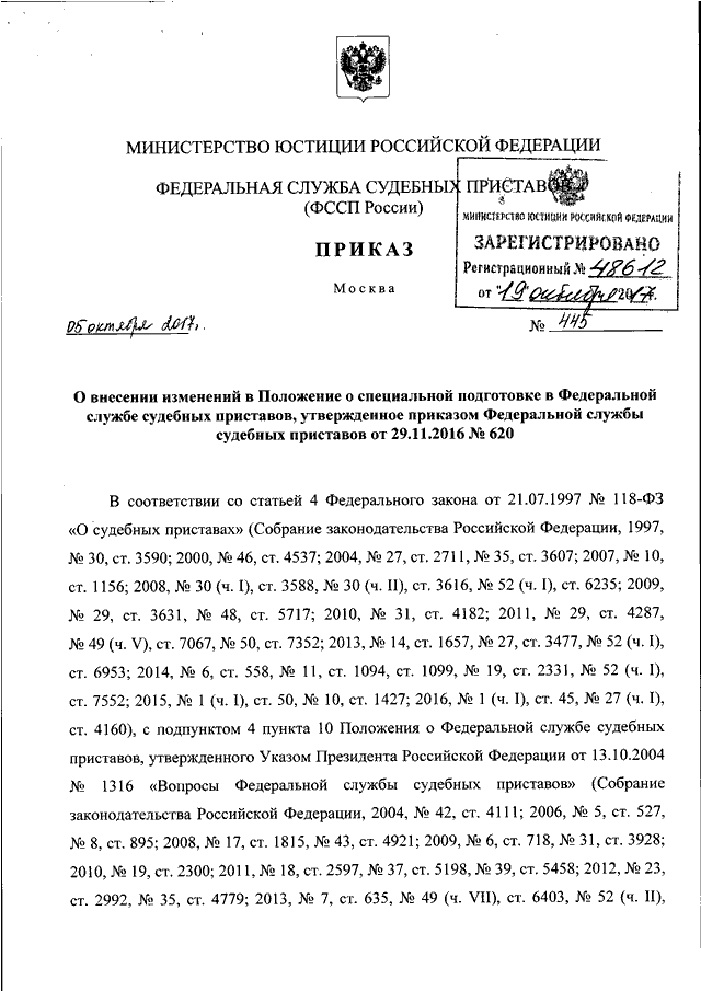 ПРИКАЗ ФССП РФ от 05.10.2017 N 445