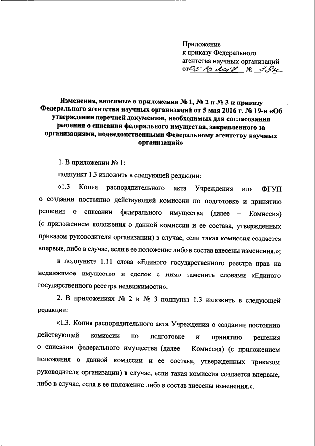 "О ВНЕСЕНИИ ИЗМЕНЕНИЙ В ПРИЛОЖЕНИЯ N 1, N 2 И N 3 К ПРИКАЗУ ФЕДЕРАЛЬНОГО АГЕНТСТВА НАУЧНЫХ ОРГАНИЗАЦИЙ ОТ 5 МАЯ 2016 Г. N 19-Н "ОБ УТВЕРЖДЕНИИ ПЕРЕЧНЕЙ ДОКУМЕНТОВ, НЕОБХОДИМЫХ ДЛЯ СОГЛАСОВАНИЯ РЕШЕНИЯ О СПИСАНИИ ФЕДЕРАЛЬНОГО ИМУЩЕСТВА, ЗАКРЕПЛЕННОГО ЗА ОРГАНИЗАЦИЯМИ, ПОДВЕДОМСТВЕННЫМИ ФЕДЕРАЛЬНОМУ АГЕНТСТВУ НАУЧНЫХ ОРГАНИЗАЦИЙ"