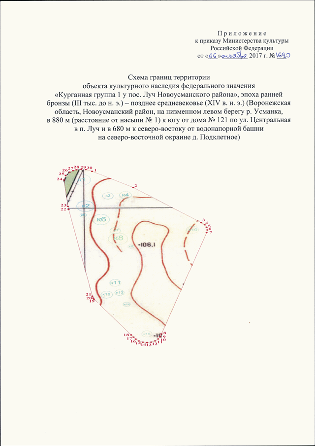"О ВКЛЮЧЕНИИ ВЫЯВЛЕННОГО ОБЪЕКТА КУЛЬТУРНОГО НАСЛЕДИЯ "КУРГАННАЯ ГРУППА 1 У ПОС. ЛУЧ НОВОУСМАНСКОГО РАЙОНА", ЭПОХА РАННЕЙ БРОНЗЫ (III ТЫС. ДО Н. Э.) - ПОЗДНЕЕ СРЕДНЕВЕКОВЬЕ (XIV В. Н. Э.) (ВОРОНЕЖСКАЯ ОБЛАСТЬ, НОВОУСМАНСКИЙ РАЙОН, НА НИЗМЕННОМ ЛЕВОМ БЕРЕГУ Р. УСМАНКА, В 880 М (РАССТОЯНИЕ ОТ НАСЫПИ N 1) К ЮГУ ОТ ДОМА N 121 ПО УЛ. ЦЕНТРАЛЬНАЯ В П. ЛУЧ И В 680 М К СЕВЕРО - ВОСТОКУ ОТ ВОДОНАПОРНОЙ БАШНИ НА СЕВЕРО - ВОСТОЧНОЙ ОКРАИНЕ Д. ПОДКЛЕТНОЕ) В ЕДИНЫЙ ГОСУДАРСТВЕННЫЙ РЕЕСТР ОБЪЕКТОВ КУЛЬТУРНОГО НАСЛЕДИЯ (ПАМЯТНИКОВ ИСТОРИИ И КУЛЬТУРЫ) НАРОДОВ РОССИЙСКОЙ ФЕДЕРАЦИИ В КАЧЕСТВЕ ОБЪЕКТА КУЛЬТУРНОГО НАСЛЕДИЯ ФЕДЕРАЛЬНОГО ЗНАЧЕНИЯ И УТВЕРЖДЕНИИ ГРАНИЦ ЕГО ТЕРРИТОРИИ"