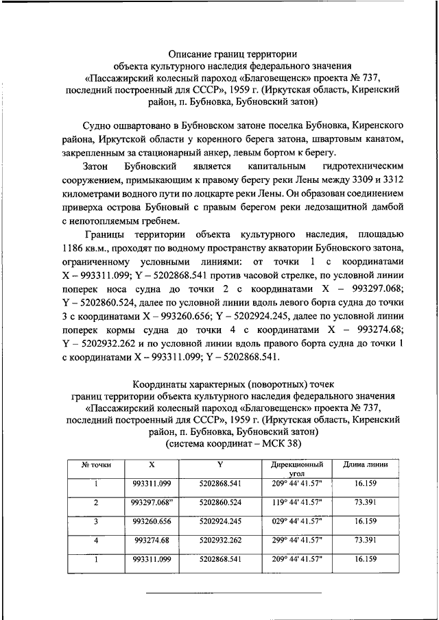 "О ВКЛЮЧЕНИИ ВЫЯВЛЕННОГО ОБЪЕКТА КУЛЬТУРНОГО НАСЛЕДИЯ "ПАССАЖИРСКИЙ КОЛЕСНЫЙ ПАРОХОД "БЛАГОВЕЩЕНСК" ПРОЕКТА N 737, ПОСЛЕДНИЙ ПОСТРОЕННЫЙ ДЛЯ СССР", 1959 Г. (ИРКУТСКАЯ ОБЛАСТЬ, КИРЕНСКИЙ РАЙОН, П. БУБНОВКА, БУБНОВСКИЙ ЗАТОН) В ЕДИНЫЙ ГОСУДАРСТВЕННЫЙ РЕЕСТР ОБЪЕКТОВ КУЛЬТУРНОГО НАСЛЕДИЯ (ПАМЯТНИКОВ ИСТОРИИ И КУЛЬТУРЫ) НАРОДОВ РОССИЙСКОЙ ФЕДЕРАЦИИ В КАЧЕСТВЕ ОБЪЕКТА КУЛЬТУРНОГО НАСЛЕДИЯ ФЕДЕРАЛЬНОГО ЗНАЧЕНИЯ И УТВЕРЖДЕНИЯ ГРАНИЦ ЕГО ТЕРРИТОРИИ"