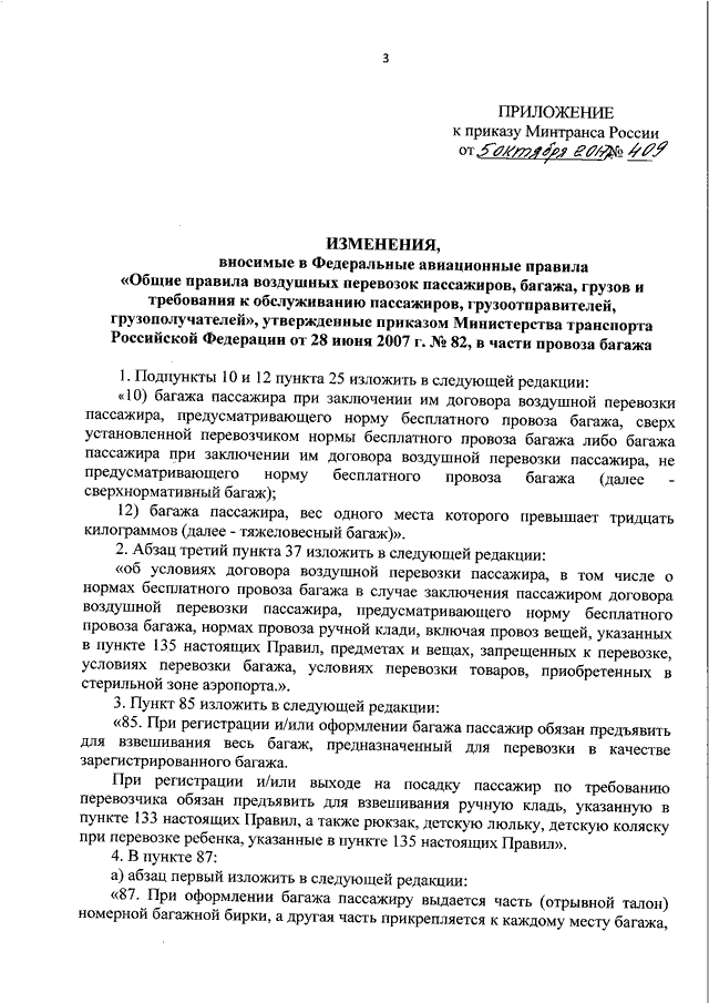 "О ВНЕСЕНИИ ИЗМЕНЕНИЙ В ФЕДЕРАЛЬНЫЕ АВИАЦИОННЫЕ ПРАВИЛА "ОБЩИЕ ПРАВИЛА ВОЗДУШНЫХ ПЕРЕВОЗОК ПАССАЖИРОВ, БАГАЖА, ГРУЗОВ И ТРЕБОВАНИЯ К ОБСЛУЖИВАНИЮ ПАССАЖИРОВ, ГРУЗООТПРАВИТЕЛЕЙ, ГРУЗОПОЛУЧАТЕЛЕЙ", УТВЕРЖДЕННЫЕ ПРИКАЗОМ МИНИСТЕРСТВА ТРАНСПОРТА РОССИЙСКОЙ ФЕДЕРАЦИИ ОТ 28 ИЮНЯ 2007 Г. N 82, В ЧАСТИ ПРОВОЗА БАГАЖА"