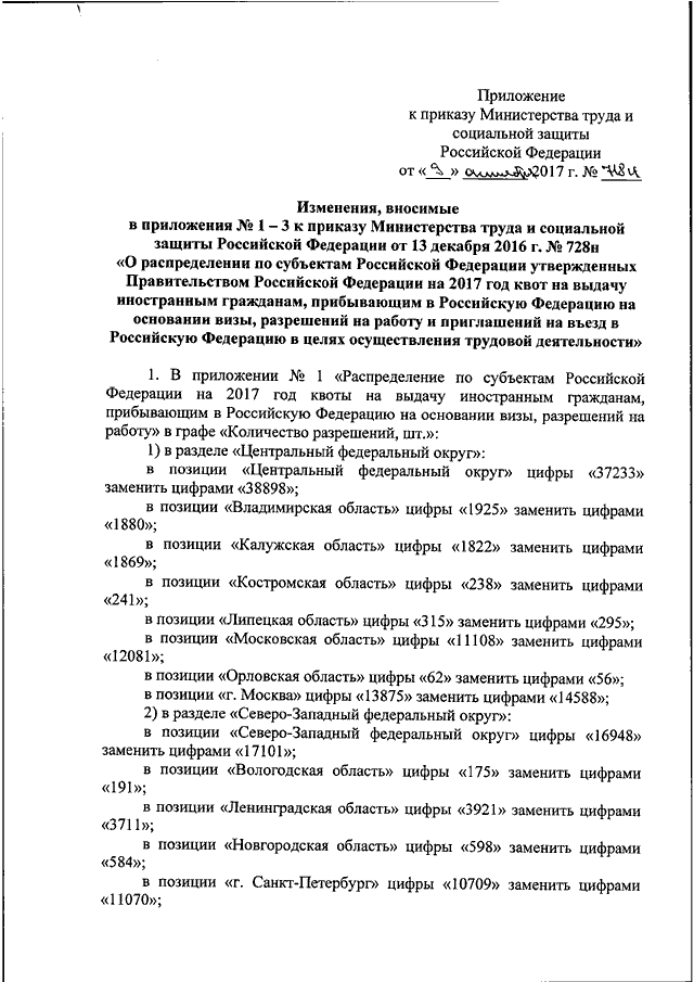 "О ВНЕСЕНИИ ИЗМЕНЕНИЙ В ПРИЛОЖЕНИЯ N 1 - 3 К ПРИКАЗУ МИНИСТЕРСТВА ТРУДА И СОЦИАЛЬНОЙ ЗАЩИТЫ РОССИЙСКОЙ ФЕДЕРАЦИИ ОТ 13 ДЕКАБРЯ 2016 Г. N 728Н "О РАСПРЕДЕЛЕНИИ ПО СУБЪЕКТАМ РОССИЙСКОЙ ФЕДЕРАЦИИ УТВЕРЖДЕННЫХ ПРАВИТЕЛЬСТВОМ РОССИЙСКОЙ ФЕДЕРАЦИИ НА 2017 ГОД КВОТ НА ВЫДАЧУ ИНОСТРАННЫМ ГРАЖДАНАМ, ПРИБЫВАЮЩИМ В РОССИЙСКУЮ ФЕДЕРАЦИЮ НА ОСНОВАНИИ ВИЗЫ, РАЗРЕШЕНИЙ НА РАБОТУ И ПРИГЛАШЕНИЙ НА ВЪЕЗД В РОССИЙСКУЮ ФЕДЕРАЦИЮ В ЦЕЛЯХ ОСУЩЕСТВЛЕНИЯ ТРУДОВОЙ ДЕЯТЕЛЬНОСТИ"