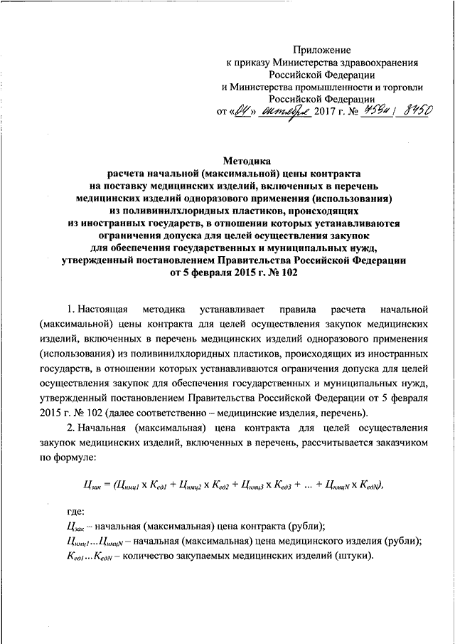 "ОБ УТВЕРЖДЕНИИ МЕТОДИКИ РАСЧЕТА НАЧАЛЬНОЙ (МАКСИМАЛЬНОЙ) ЦЕНЫ КОНТРАКТА НА ПОСТАВКУ МЕДИЦИНСКИХ ИЗДЕЛИЙ, ВКЛЮЧЕННЫХ В ПЕРЕЧЕНЬ МЕДИЦИНСКИХ ИЗДЕЛИЙ ОДНОРАЗОВОГО ПРИМЕНЕНИЯ (ИСПОЛЬЗОВАНИЯ) ИЗ ПОЛИВИНИЛХЛОРИДНЫХ ПЛАСТИКОВ, ПРОИСХОДЯЩИХ ИЗ ИНОСТРАННЫХ ГОСУДАРСТВ, В ОТНОШЕНИИ КОТОРЫХ УСТАНАВЛИВАЮТСЯ ОГРАНИЧЕНИЯ ДОПУСКА ДЛЯ ЦЕЛЕЙ ОСУЩЕСТВЛЕНИЯ ЗАКУПОК ДЛЯ ОБЕСПЕЧЕНИЯ ГОСУДАРСТВЕННЫХ И МУНИЦИПАЛЬНЫХ НУЖД, УТВЕРЖДЕННЫЙ ПОСТАНОВЛЕНИЕМ ПРАВИТЕЛЬСТВА РОССИЙСКОЙ ФЕДЕРАЦИИ ОТ 5 ФЕВРАЛЯ 2015 Г. N 102"