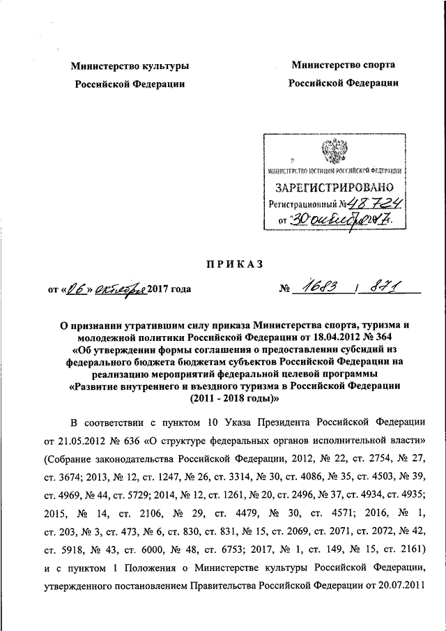 ПРИКАЗ Минкультуры РФ N 1683, Минспорта РФ N 871 от 06.10.2017