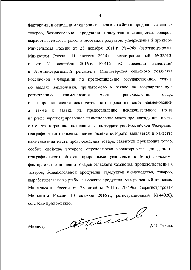 "О ВНЕСЕНИИ ИЗМЕНЕНИЙ В АДМИНИСТРАТИВНЫЙ РЕГЛАМЕНТ МИНИСТЕРСТВА СЕЛЬСКОГО ХОЗЯЙСТВА РОССИЙСКОЙ ФЕДЕРАЦИИ ПО ПРЕДОСТАВЛЕНИЮ ГОСУДАРСТВЕННОЙ УСЛУГИ ПО ВЫДАЧЕ ЗАКЛЮЧЕНИЯ, ПРИЛАГАЕМОГО К ЗАЯВКЕ НА ГОСУДАРСТВЕННУЮ РЕГИСТРАЦИЮ НАИМЕНОВАНИЯ МЕСТА ПРОИСХОЖДЕНИЯ ТОВАРА И НА ПРЕДОСТАВЛЕНИЕ ИСКЛЮЧИТЕЛЬНОГО ПРАВА НА ТАКОЕ НАИМЕНОВАНИЕ, А ТАКЖЕ К ЗАЯВКЕ НА ПРЕДОСТАВЛЕНИЕ ИСКЛЮЧИТЕЛЬНОГО ПРАВА НА РАНЕЕ ЗАРЕГИСТРИРОВАННОЕ НАИМЕНОВАНИЕ МЕСТА ПРОИСХОЖДЕНИЯ ТОВАРА, О ТОМ, ЧТО В ГРАНИЦАХ НАХОДЯЩЕГОСЯ НА ТЕРРИТОРИИ РОССИЙСКОЙ ФЕДЕРАЦИИ ГЕОГРАФИЧЕСКОГО ОБЪЕКТА, НАИМЕНОВАНИЕ КОТОРОГО ЗАЯВЛЯЕТСЯ В КАЧЕСТВЕ НАИМЕНОВАНИЯ МЕСТА ПРОИСХОЖДЕНИЯ ТОВАРА, ЗАЯВИТЕЛЬ ПРОИЗВОДИТ ТОВАР, ОСОБЫЕ СВОЙСТВА КОТОРОГО ОПРЕДЕЛЯЮТСЯ ХАРАКТЕРНЫМИ ДЛЯ ДАННОГО ГЕОГРАФИЧЕСКОГО ОБЪЕКТА ПРИРОДНЫМИ УСЛОВИЯМИ И (ИЛИ) ЛЮДСКИМИ ФАКТОРАМИ, В ОТНОШЕНИИ ТОВАРОВ СЕЛЬСКОГО ХОЗЯЙСТВА, ПРОДОВОЛЬСТВЕННЫХ ТОВАРОВ, БЕЗАЛКОГОЛЬНОЙ ПРОДУКЦИИ, ПРОДУКТОВ ПЧЕЛОВОДСТВА, ТОВАРОВ, ВЫРАБАТЫВАЕМЫХ ИЗ РЫБЫ И МОРСКИХ ПРОДУКТОВ, УТВЕРЖДЕННЫЙ ПРИКАЗОМ МИНСЕЛЬХОЗА РОССИИ ОТ 28 ДЕКАБРЯ 2011 Г. N 496"