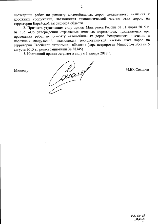 "ОБ УТВЕРЖДЕНИИ ОТРАСЛЕВЫХ СМЕТНЫХ НОРМАТИВОВ, ПРИМЕНЯЕМЫХ ПРИ ПРОВЕДЕНИИ РАБОТ ПО РЕМОНТУ АВТОМОБИЛЬНЫХ ДОРОГ ФЕДЕРАЛЬНОГО ЗНАЧЕНИЯ И ДОРОЖНЫХ СООРУЖЕНИЙ, ЯВЛЯЮЩИХСЯ ТЕХНОЛОГИЧЕСКОЙ ЧАСТЬЮ ЭТИХ ДОРОГ, НА ТЕРРИТОРИИ ЕВРЕЙСКОЙ АВТОНОМНОЙ ОБЛАСТИ И О ПРИЗНАНИИ УТРАТИВШИМ СИЛУ ПРИКАЗА МИНТРАНСА РОССИИ ОТ 31 МАРТА 2015 Г. N 135 "ОБ УТВЕРЖДЕНИИ ОТРАСЛЕВЫХ СМЕТНЫХ НОРМАТИВОВ, ПРИМЕНЯЕМЫХ ПРИ ПРОВЕДЕНИИ РАБОТ ПО РЕМОНТУ АВТОМОБИЛЬНЫХ ДОРОГ ФЕДЕРАЛЬНОГО ЗНАЧЕНИЯ И ДОРОЖНЫХ СООРУЖЕНИЙ, ЯВЛЯЮЩИХСЯ ТЕХНОЛОГИЧЕСКОЙ ЧАСТЬЮ ЭТИХ ДОРОГ НА ТЕРРИТОРИИ ЕВРЕЙСКОЙ АВТОНОМНОЙ ОБЛАСТИ"