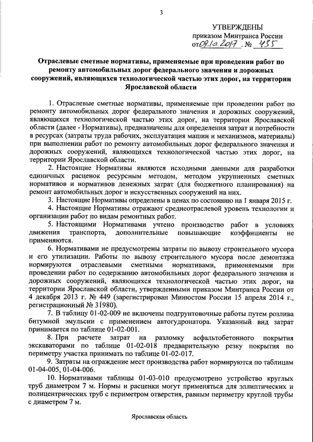 "ОБ УТВЕРЖДЕНИИ ОТРАСЛЕВЫХ СМЕТНЫХ НОРМАТИВОВ, ПРИМЕНЯЕМЫХ ПРИ ПРОВЕДЕНИИ РАБОТ ПО РЕМОНТУ АВТОМОБИЛЬНЫХ ДОРОГ ФЕДЕРАЛЬНОГО ЗНАЧЕНИЯ И ДОРОЖНЫХ СООРУЖЕНИЙ, ЯВЛЯЮЩИХСЯ ТЕХНОЛОГИЧЕСКОЙ ЧАСТЬЮ ЭТИХ ДОРОГ, НА ТЕРРИТОРИИ ЯРОСЛАВСКОЙ ОБЛАСТИ И О ПРИЗНАНИИ УТРАТИВШИМ СИЛУ ПРИКАЗА МИНТРАНСА РОССИИ ОТ 31 МАРТА 2015 Г. N 134 "ОБ УТВЕРЖДЕНИИ ОТРАСЛЕВЫХ СМЕТНЫХ НОРМАТИВОВ, ПРИМЕНЯЕМЫХ ПРИ ПРОВЕДЕНИИ РАБОТ ПО РЕМОНТУ АВТОМОБИЛЬНЫХ ДОРОГ ФЕДЕРАЛЬНОГО ЗНАЧЕНИЯ И ДОРОЖНЫХ СООРУЖЕНИЙ, ЯВЛЯЮЩИХСЯ ТЕХНОЛОГИЧЕСКОЙ ЧАСТЬЮ ЭТИХ ДОРОГ НА ТЕРРИТОРИИ ЯРОСЛАВСКОЙ ОБЛАСТИ"