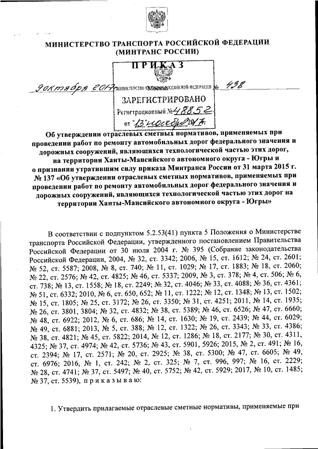 ПРИКАЗ Минтранса РФ от 09.10.2017 N 438