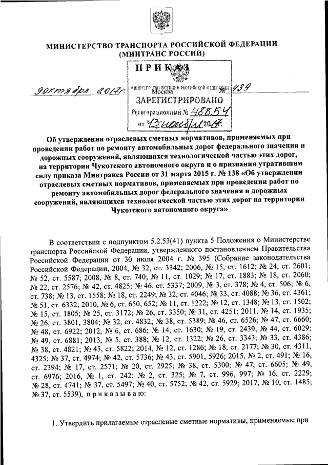 ПРИКАЗ Минтранса РФ от 09.10.2017 N 439