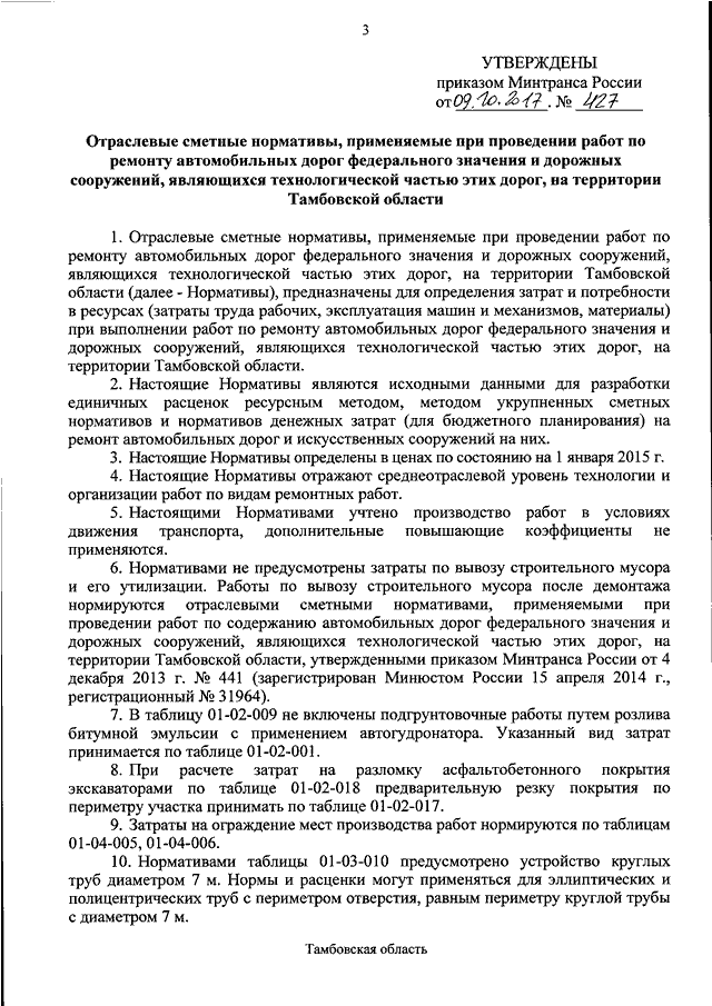 "ОБ УТВЕРЖДЕНИИ ОТРАСЛЕВЫХ СМЕТНЫХ НОРМАТИВОВ, ПРИМЕНЯЕМЫХ ПРИ ПРОВЕДЕНИИ РАБОТ ПО РЕМОНТУ АВТОМОБИЛЬНЫХ ДОРОГ ФЕДЕРАЛЬНОГО ЗНАЧЕНИЯ И ДОРОЖНЫХ СООРУЖЕНИЙ, ЯВЛЯЮЩИХСЯ ТЕХНОЛОГИЧЕСКОЙ ЧАСТЬЮ ЭТИХ ДОРОГ, НА ТЕРРИТОРИИ ТАМБОВСКОЙ ОБЛАСТИ И О ПРИЗНАНИИ УТРАТИВШИМ СИЛУ ПРИКАЗА МИНТРАНСА РОССИИ ОТ 31 МАРТА 2015 Г. N 126 "ОБ УТВЕРЖДЕНИИ ОТРАСЛЕВЫХ СМЕТНЫХ НОРМАТИВОВ, ПРИМЕНЯЕМЫХ ПРИ ПРОВЕДЕНИИ РАБОТ ПО РЕМОНТУ АВТОМОБИЛЬНЫХ ДОРОГ ФЕДЕРАЛЬНОГО ЗНАЧЕНИЯ И ДОРОЖНЫХ СООРУЖЕНИЙ, ЯВЛЯЮЩИХСЯ ТЕХНОЛОГИЧЕСКОЙ ЧАСТЬЮ ЭТИХ ДОРОГ НА ТЕРРИТОРИИ ТАМБОВСКОЙ ОБЛАСТИ"