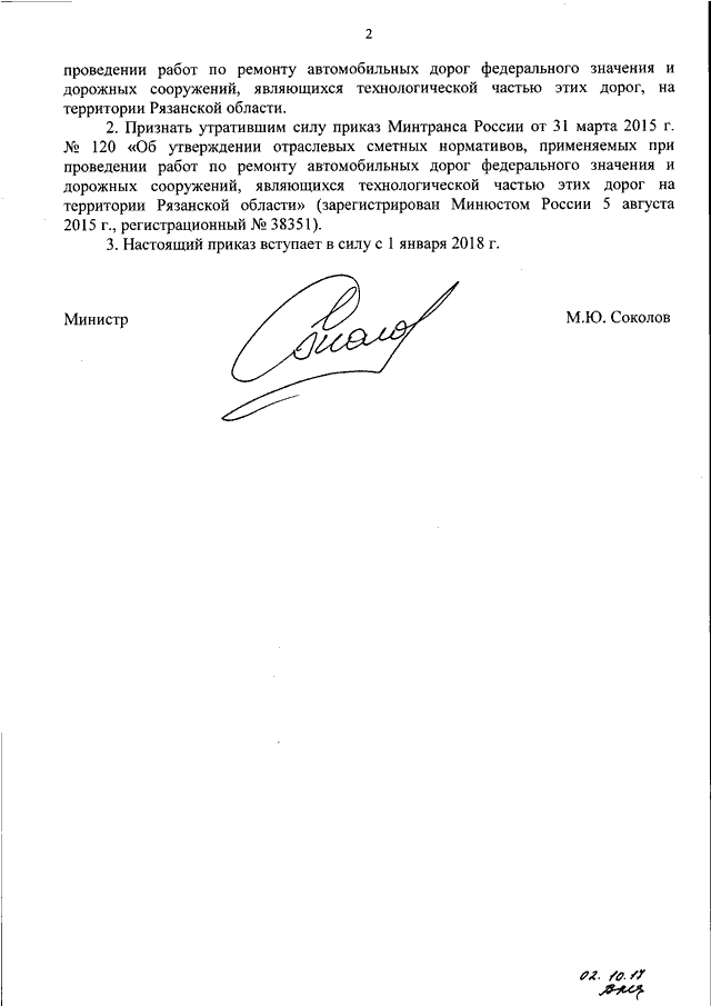 "ОБ УТВЕРЖДЕНИИ ОТРАСЛЕВЫХ СМЕТНЫХ НОРМАТИВОВ, ПРИМЕНЯЕМЫХ ПРИ ПРОВЕДЕНИИ РАБОТ ПО РЕМОНТУ АВТОМОБИЛЬНЫХ ДОРОГ ФЕДЕРАЛЬНОГО ЗНАЧЕНИЯ И ДОРОЖНЫХ СООРУЖЕНИЙ, ЯВЛЯЮЩИХСЯ ТЕХНОЛОГИЧЕСКОЙ ЧАСТЬЮ ЭТИХ ДОРОГ, НА ТЕРРИТОРИИ РЯЗАНСКОЙ ОБЛАСТИ И О ПРИЗНАНИИ УТРАТИВШИМ СИЛУ ПРИКАЗА МИНТРАНСА РОССИИ ОТ 31 МАРТА 2015 Г. N 120 "ОБ УТВЕРЖДЕНИИ ОТРАСЛЕВЫХ СМЕТНЫХ НОРМАТИВОВ, ПРИМЕНЯЕМЫХ ПРИ ПРОВЕДЕНИИ РАБОТ ПО РЕМОНТУ АВТОМОБИЛЬНЫХ ДОРОГ ФЕДЕРАЛЬНОГО ЗНАЧЕНИЯ И ДОРОЖНЫХ СООРУЖЕНИЙ, ЯВЛЯЮЩИХСЯ ТЕХНОЛОГИЧЕСКОЙ ЧАСТЬЮ ЭТИХ ДОРОГ НА ТЕРРИТОРИИ РЯЗАНСКОЙ ОБЛАСТИ"