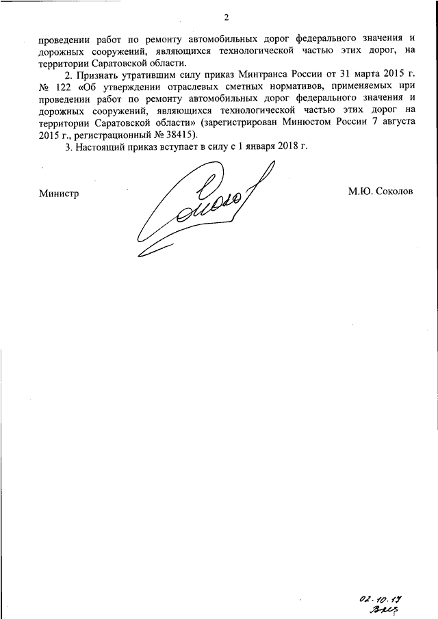 "ОБ УТВЕРЖДЕНИИ ОТРАСЛЕВЫХ СМЕТНЫХ НОРМАТИВОВ, ПРИМЕНЯЕМЫХ ПРИ ПРОВЕДЕНИИ РАБОТ ПО РЕМОНТУ АВТОМОБИЛЬНЫХ ДОРОГ ФЕДЕРАЛЬНОГО ЗНАЧЕНИЯ И ДОРОЖНЫХ СООРУЖЕНИЙ, ЯВЛЯЮЩИХСЯ ТЕХНОЛОГИЧЕСКОЙ ЧАСТЬЮ ЭТИХ ДОРОГ, НА ТЕРРИТОРИИ САРАТОВСКОЙ ОБЛАСТИ И О ПРИЗНАНИИ УТРАТИВШИМ СИЛУ ПРИКАЗА МИНТРАНСА РОССИИ ОТ 31 МАРТА 2015 Г. N 122 "ОБ УТВЕРЖДЕНИИ ОТРАСЛЕВЫХ СМЕТНЫХ НОРМАТИВОВ, ПРИМЕНЯЕМЫХ ПРИ ПРОВЕДЕНИИ РАБОТ ПО РЕМОНТУ АВТОМОБИЛЬНЫХ ДОРОГ ФЕДЕРАЛЬНОГО ЗНАЧЕНИЯ И ДОРОЖНЫХ СООРУЖЕНИЙ, ЯВЛЯЮЩИХСЯ ТЕХНОЛОГИЧЕСКОЙ ЧАСТЬЮ ЭТИХ ДОРОГ НА ТЕРРИТОРИИ САРАТОВСКОЙ ОБЛАСТИ"
