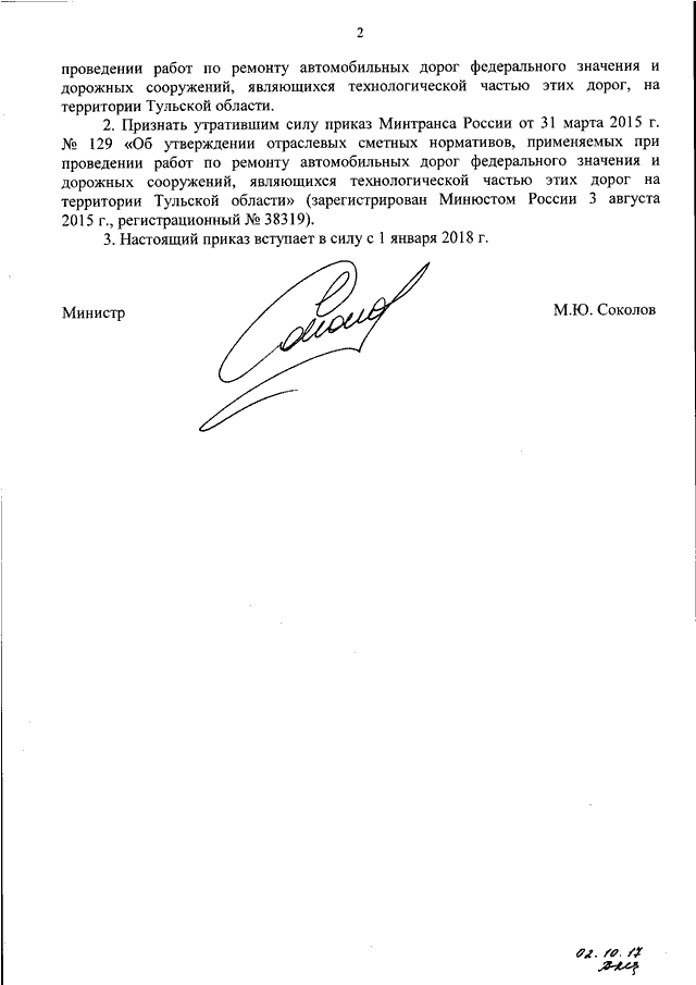 "ОБ УТВЕРЖДЕНИИ ОТРАСЛЕВЫХ СМЕТНЫХ НОРМАТИВОВ, ПРИМЕНЯЕМЫХ ПРИ ПРОВЕДЕНИИ РАБОТ ПО РЕМОНТУ АВТОМОБИЛЬНЫХ ДОРОГ ФЕДЕРАЛЬНОГО ЗНАЧЕНИЯ И ДОРОЖНЫХ СООРУЖЕНИЙ, ЯВЛЯЮЩИХСЯ ТЕХНОЛОГИЧЕСКОЙ ЧАСТЬЮ ЭТИХ ДОРОГ, НА ТЕРРИТОРИИ ТУЛЬСКОЙ ОБЛАСТИ И О ПРИЗНАНИИ УТРАТИВШИМ СИЛУ ПРИКАЗА МИНТРАНСА РОССИИ ОТ 31 МАРТА 2015 Г. N 129 "ОБ УТВЕРЖДЕНИИ ОТРАСЛЕВЫХ СМЕТНЫХ НОРМАТИВОВ, ПРИМЕНЯЕМЫХ ПРИ ПРОВЕДЕНИИ РАБОТ ПО РЕМОНТУ АВТОМОБИЛЬНЫХ ДОРОГ ФЕДЕРАЛЬНОГО ЗНАЧЕНИЯ И ДОРОЖНЫХ СООРУЖЕНИЙ, ЯВЛЯЮЩИХСЯ ТЕХНОЛОГИЧЕСКОЙ ЧАСТЬЮ ЭТИХ ДОРОГ НА ТЕРРИТОРИИ ТУЛЬСКОЙ ОБЛАСТИ"