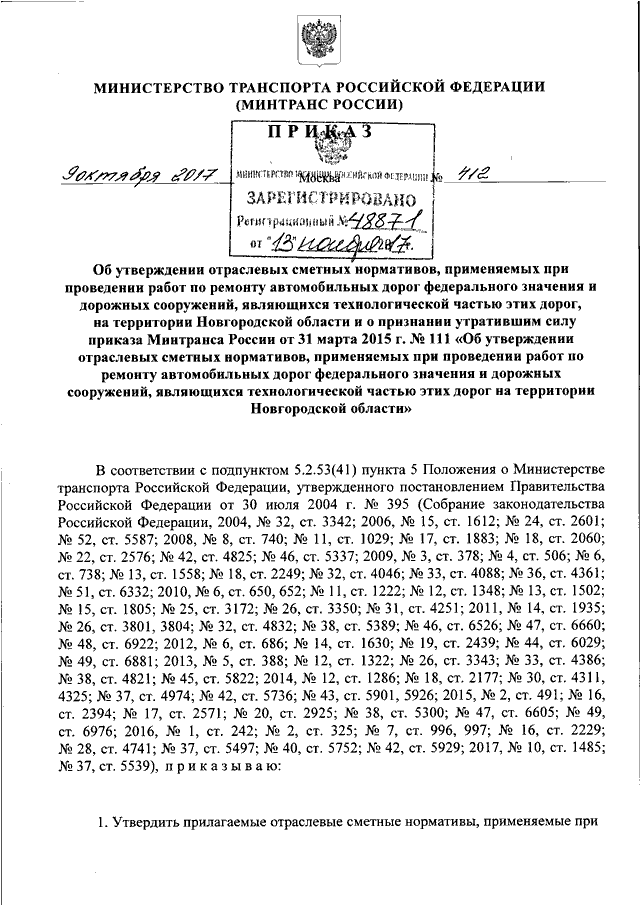 ПРИКАЗ Минтранса РФ от 09.10.2017 N 412
