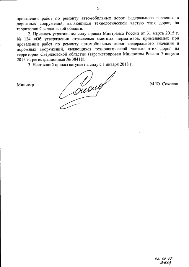 "ОБ УТВЕРЖДЕНИИ ОТРАСЛЕВЫХ СМЕТНЫХ НОРМАТИВОВ, ПРИМЕНЯЕМЫХ ПРИ ПРОВЕДЕНИИ РАБОТ ПО РЕМОНТУ АВТОМОБИЛЬНЫХ ДОРОГ ФЕДЕРАЛЬНОГО ЗНАЧЕНИЯ И ДОРОЖНЫХ СООРУЖЕНИЙ, ЯВЛЯЮЩИХСЯ ТЕХНОЛОГИЧЕСКОЙ ЧАСТЬЮ ЭТИХ ДОРОГ, НА ТЕРРИТОРИИ СВЕРДЛОВСКОЙ ОБЛАСТИ И О ПРИЗНАНИИ УТРАТИВШИМ СИЛУ ПРИКАЗА МИНТРАНСА РОССИИ ОТ 31 МАРТА 2015 Г. N 124 "ОБ УТВЕРЖДЕНИИ ОТРАСЛЕВЫХ СМЕТНЫХ НОРМАТИВОВ, ПРИМЕНЯЕМЫХ ПРИ ПРОВЕДЕНИИ РАБОТ ПО РЕМОНТУ АВТОМОБИЛЬНЫХ ДОРОГ ФЕДЕРАЛЬНОГО ЗНАЧЕНИЯ И ДОРОЖНЫХ СООРУЖЕНИЙ, ЯВЛЯЮЩИХСЯ ТЕХНОЛОГИЧЕСКОЙ ЧАСТЬЮ ЭТИХ ДОРОГ НА ТЕРРИТОРИИ СВЕРДЛОВСКОЙ ОБЛАСТИ"