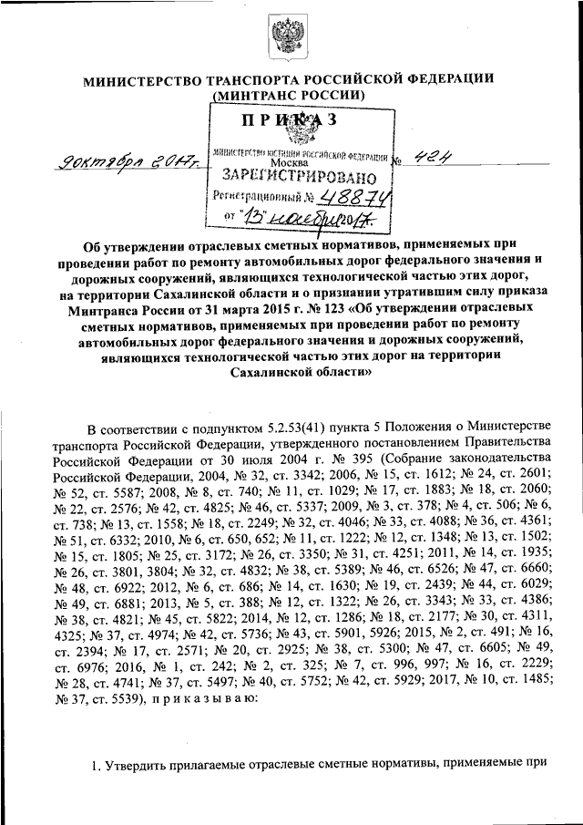 ПРИКАЗ Минтранса РФ от 09.10.2017 N 424