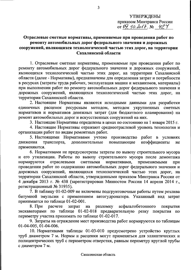"ОБ УТВЕРЖДЕНИИ ОТРАСЛЕВЫХ СМЕТНЫХ НОРМАТИВОВ, ПРИМЕНЯЕМЫХ ПРИ ПРОВЕДЕНИИ РАБОТ ПО РЕМОНТУ АВТОМОБИЛЬНЫХ ДОРОГ ФЕДЕРАЛЬНОГО ЗНАЧЕНИЯ И ДОРОЖНЫХ СООРУЖЕНИЙ, ЯВЛЯЮЩИХСЯ ТЕХНОЛОГИЧЕСКОЙ ЧАСТЬЮ ЭТИХ ДОРОГ, НА ТЕРРИТОРИИ САХАЛИНСКОЙ ОБЛАСТИ И О ПРИЗНАНИИ УТРАТИВШИМ СИЛУ ПРИКАЗА МИНТРАНСА РОССИИ ОТ 31 МАРТА 2015 Г. N 123 "ОБ УТВЕРЖДЕНИИ ОТРАСЛЕВЫХ СМЕТНЫХ НОРМАТИВОВ, ПРИМЕНЯЕМЫХ ПРИ ПРОВЕДЕНИИ РАБОТ ПО РЕМОНТУ АВТОМОБИЛЬНЫХ ДОРОГ ФЕДЕРАЛЬНОГО ЗНАЧЕНИЯ И ДОРОЖНЫХ СООРУЖЕНИЙ, ЯВЛЯЮЩИХСЯ ТЕХНОЛОГИЧЕСКОЙ ЧАСТЬЮ ЭТИХ ДОРОГ НА ТЕРРИТОРИИ САХАЛИНСКОЙ ОБЛАСТИ"