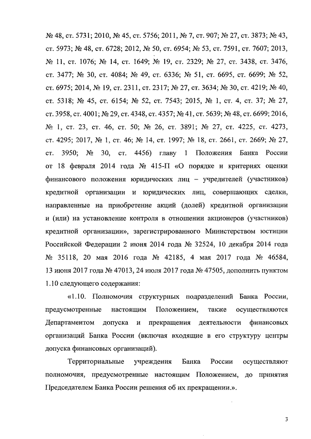 "О ВНЕСЕНИИ ИЗМЕНЕНИЯ В ГЛАВУ 1 ПОЛОЖЕНИЯ БАНКА РОССИИ ОТ 18 ФЕВРАЛЯ 2014 Г. N 415-П "О ПОРЯДКЕ И КРИТЕРИЯХ ОЦЕНКИ ФИНАНСОВОГО ПОЛОЖЕНИЯ ЮРИДИЧЕСКИХ ЛИЦ - УЧРЕДИТЕЛЕЙ (УЧАСТНИКОВ) КРЕДИТНОЙ ОРГАНИЗАЦИИ И ЮРИДИЧЕСКИХ ЛИЦ, СОВЕРШАЮЩИХ СДЕЛКИ, НАПРАВЛЕННЫЕ НА ПРИОБРЕТЕНИЕ АКЦИЙ (ДОЛЕЙ) КРЕДИТНОЙ ОРГАНИЗАЦИИ И (ИЛИ) НА УСТАНОВЛЕНИЕ КОНТРОЛЯ В ОТНОШЕНИИ АКЦИОНЕРОВ (УЧАСТНИКОВ) КРЕДИТНОЙ ОРГАНИЗАЦИИ"