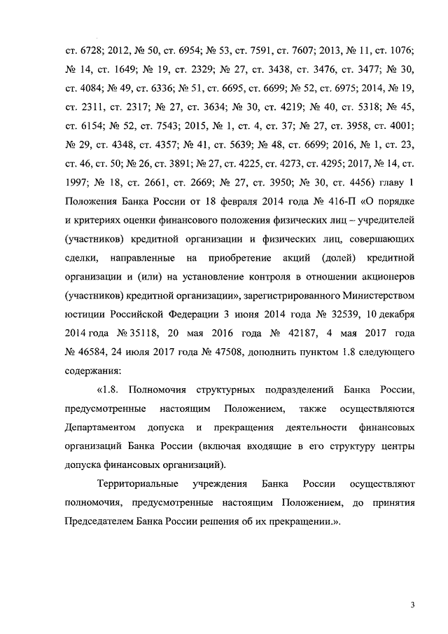 "О ВНЕСЕНИИ ИЗМЕНЕНИЯ В ГЛАВУ 1 ПОЛОЖЕНИЯ БАНКА РОССИИ ОТ 18 ФЕВРАЛЯ 2014 Г. N 416-П "О ПОРЯДКЕ И КРИТЕРИЯХ ОЦЕНКИ ФИНАНСОВОГО ПОЛОЖЕНИЯ ФИЗИЧЕСКИХ ЛИЦ - УЧРЕДИТЕЛЕЙ (УЧАСТНИКОВ) КРЕДИТНОЙ ОРГАНИЗАЦИИ И ФИЗИЧЕСКИХ ЛИЦ, СОВЕРШАЮЩИХ СДЕЛКИ, НАПРАВЛЕННЫЕ НА ПРИОБРЕТЕНИЕ АКЦИЙ (ДОЛЕЙ) КРЕДИТНОЙ ОРГАНИЗАЦИИ И (ИЛИ) НА УСТАНОВЛЕНИЕ КОНТРОЛЯ В ОТНОШЕНИИ АКЦИОНЕРОВ (УЧАСТНИКОВ) КРЕДИТНОЙ ОРГАНИЗАЦИИ"