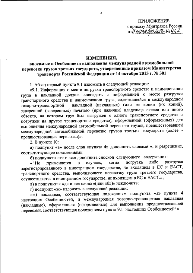 "О ВНЕСЕНИИ ИЗМЕНЕНИЙ В ОСОБЕННОСТИ ВЫПОЛНЕНИЯ МЕЖДУНАРОДНОЙ АВТОМОБИЛЬНОЙ ПЕРЕВОЗКИ ГРУЗОВ ТРЕТЬИХ ГОСУДАРСТВ, УТВЕРЖДЕННЫЕ ПРИКАЗОМ МИНИСТЕРСТВА ТРАНСПОРТА РОССИЙСКОЙ ФЕДЕРАЦИИ ОТ 14 ОКТЯБРЯ 2015 Г. N 301"