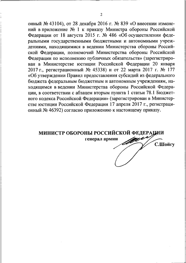"О ВНЕСЕНИИ ИЗМЕНЕНИЙ В ПРИЛОЖЕНИЯ N 1 И 2 К ПРИКАЗУ МИНИСТРА ОБОРОНЫ РОССИЙСКОЙ ФЕДЕРАЦИИ ОТ 18 АВГУСТА 2015 Г. N 486 "ОБ ОСУЩЕСТВЛЕНИИ ФЕДЕРАЛЬНЫМИ ГОСУДАРСТВЕННЫМИ БЮДЖЕТНЫМИ И АВТОНОМНЫМИ УЧРЕЖДЕНИЯМИ, НАХОДЯЩИМИСЯ В ВЕДЕНИИ МИНИСТЕРСТВА ОБОРОНЫ РОССИЙСКОЙ ФЕДЕРАЦИИ, ПОЛНОМОЧИЙ МИНИСТЕРСТВА ОБОРОНЫ РОССИЙСКОЙ ФЕДЕРАЦИИ ПО ИСПОЛНЕНИЮ ПУБЛИЧНЫХ ОБЯЗАТЕЛЬСТВ"