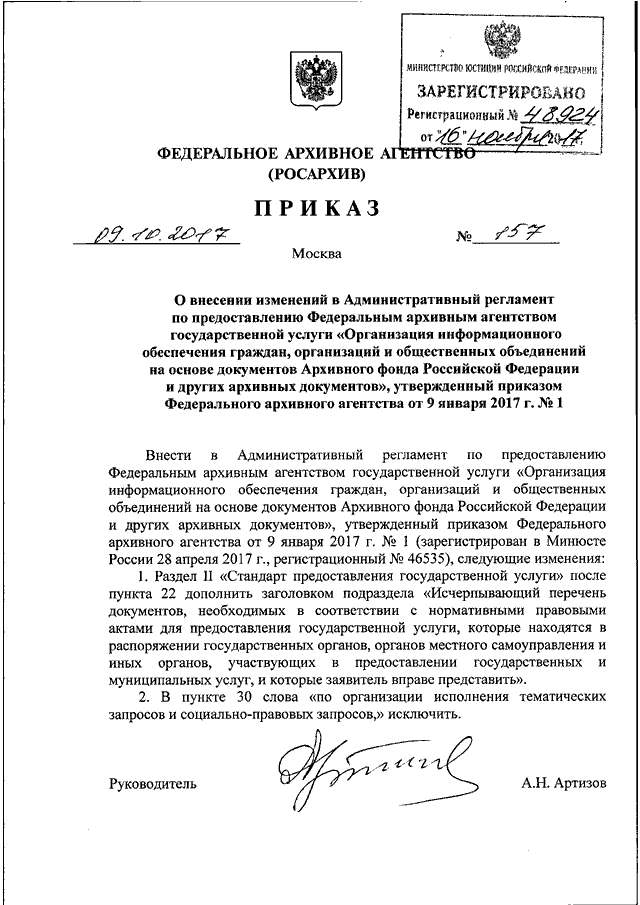ПРИКАЗ Росархива от 09.10.2017 N 157