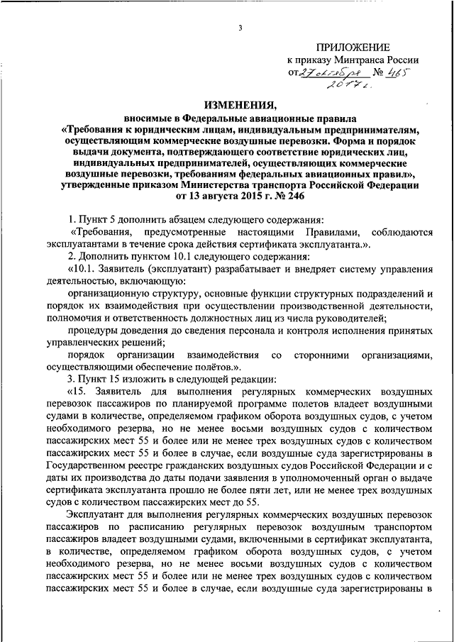 "О ВНЕСЕНИИ ИЗМЕНЕНИЙ В ФЕДЕРАЛЬНЫЕ АВИАЦИОННЫЕ ПРАВИЛА "ТРЕБОВАНИЯ К ЮРИДИЧЕСКИМ ЛИЦАМ, ИНДИВИДУАЛЬНЫМ ПРЕДПРИНИМАТЕЛЯМ, ОСУЩЕСТВЛЯЮЩИМ КОММЕРЧЕСКИЕ ВОЗДУШНЫЕ ПЕРЕВОЗКИ. ФОРМА И ПОРЯДОК ВЫДАЧИ ДОКУМЕНТА, ПОДТВЕРЖДАЮЩЕГО СООТВЕТСТВИЕ ЮРИДИЧЕСКИХ ЛИЦ, ИНДИВИДУАЛЬНЫХ ПРЕДПРИНИМАТЕЛЕЙ, ОСУЩЕСТВЛЯЮЩИХ КОММЕРЧЕСКИЕ ВОЗДУШНЫЕ ПЕРЕВОЗКИ, ТРЕБОВАНИЯМ ФЕДЕРАЛЬНЫХ АВИАЦИОННЫХ ПРАВИЛ", УТВЕРЖДЕННЫЕ ПРИКАЗОМ МИНИСТЕРСТВА ТРАНСПОРТА РОССИЙСКОЙ ФЕДЕРАЦИИ ОТ 13 АВГУСТА 2015 Г. N 246"