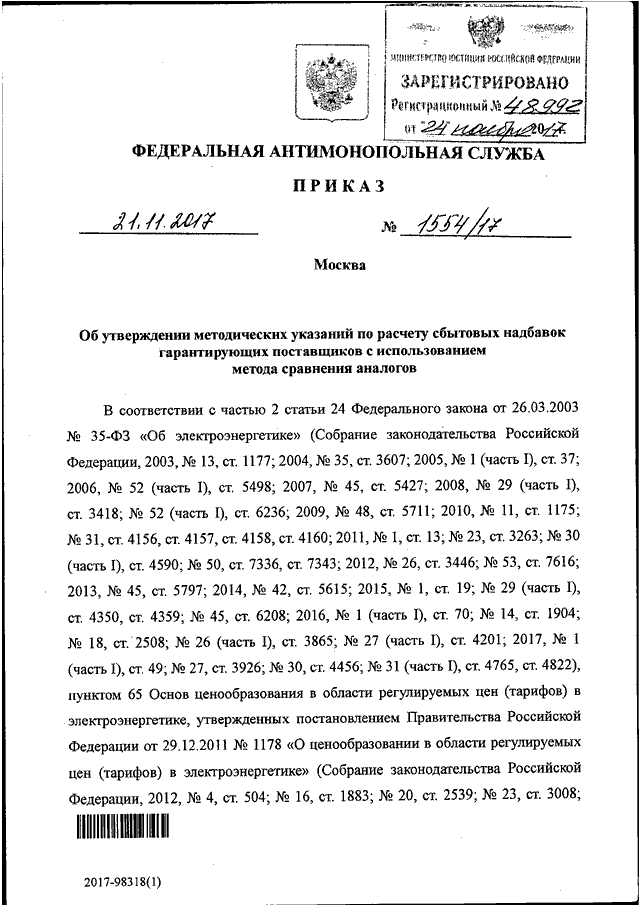 ПРИКАЗ Федеральной антимонопольной службы от 21.11.2017 N 1554/17