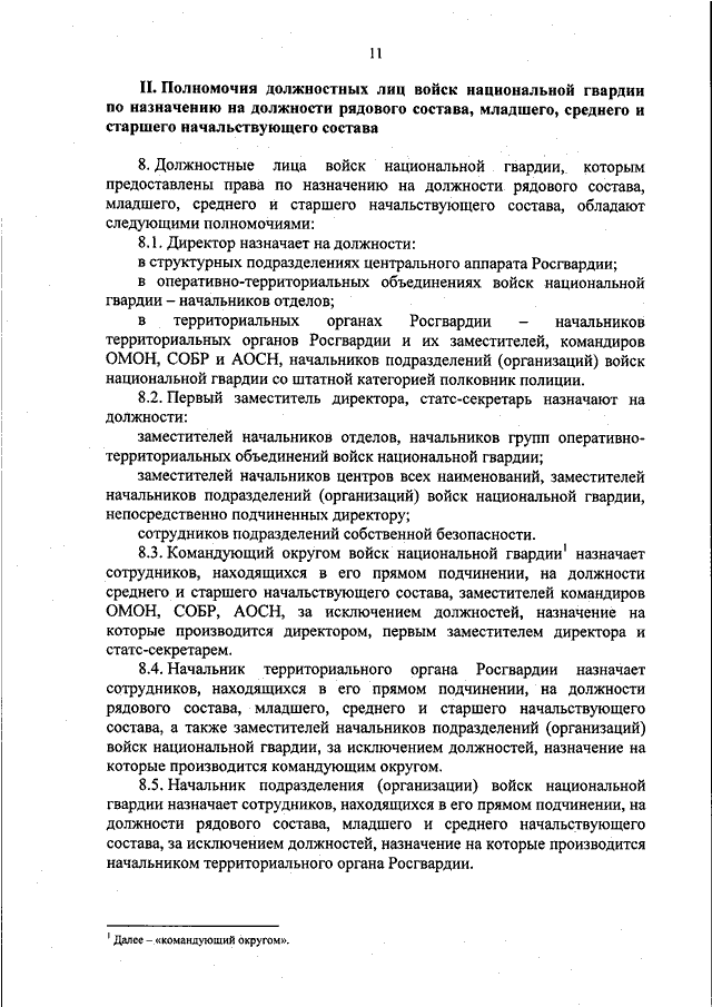 (вместе с "ПОРЯДКОМ РЕАЛИЗАЦИИ В ВОЙСКАХ НАЦИОНАЛЬНОЙ ГВАРДИИ РОССИЙСКОЙ ФЕДЕРАЦИИ НОРМАТИВНЫХ ПРАВОВЫХ АКТОВ ПО ВОПРОСАМ НАЗНАЧЕНИЯ ВОЕННОСЛУЖАЩИХ, ПРОХОДЯЩИХ ВОЕННУЮ СЛУЖБУ ПО КОНТРАКТУ, НА ВОИНСКИЕ ДОЛЖНОСТИ, ОСВОБОЖДЕНИЯ ИХ ОТ ВОИНСКИХ ДОЛЖНОСТЕЙ, УВОЛЬНЕНИЯ С ВОЕННОЙ СЛУЖБЫ И ПРИСВОЕНИЯ ИМ ВОИНСКИХ ЗВАНИЙ", "ПОРЯДКОМ НАЗНАЧЕНИЯ НА ДОЛЖНОСТИ РЯДОВОГО СОСТАВА, МЛАДШЕГО, СРЕДНЕГО И СТАРШЕГО НАЧАЛЬСТВУЮЩЕГО СОСТАВА, ПРИСВОЕНИЯ ОЧЕРЕДНЫХ СПЕЦИАЛЬНЫХ ЗВАНИЙ ДО ПОДПОЛКОВНИКА ПОЛИЦИИ ВКЛЮЧИТЕЛЬНО, А ТАКЖЕ ПЕРВЫХ И ОЧЕРЕДНЫХ СПЕЦИАЛЬНЫХ ЗВАНИЙ, СООТВЕТСТВУЮЩИХ ДОЛЖНОСТЯМ РЯДОВОГО СОСТАВА И МЛАДШЕГО НАЧАЛЬСТВУЮЩЕГО СОСТАВА, ПРЕДСТАВЛЕНИЯ ЛИЦ, ПРОХОДЯЩИХ СЛУЖБУ В ВОЙСКАХ НАЦИОНАЛЬНОЙ ГВАРДИИ РОССИЙСКОЙ ФЕДЕРАЦИИ И ИМЕЮЩИХ СПЕЦИАЛЬНЫЕ ЗВАНИЯ ПОЛИЦИИ, К УВОЛЬНЕНИЮ СО СЛУЖБЫ В ВОЙСКАХ НАЦИОНАЛЬНОЙ ГВАРДИИ РОССИЙСКОЙ ФЕДЕРАЦИИ") (Зарегистрировано в Минюсте РФ 27.11.2017 N 49014)