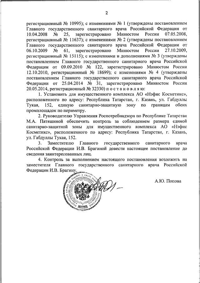 "ОБ УСТАНОВЛЕНИИ РАЗМЕРА ЕДИНОЙ САНИТАРНО - ЗАЩИТНОЙ ЗОНЫ ДЛЯ ИМУЩЕСТВЕННОГО КОМПЛЕКСА АО "НЭФИС КОСМЕТИКС", РАСПОЛОЖЕННОГО ПО АДРЕСУ: РЕСПУБЛИКА ТАТАРСТАН, Г. КАЗАНЬ, УЛ. ГАБДУЛЛЫ ТУКАЯ, 152"